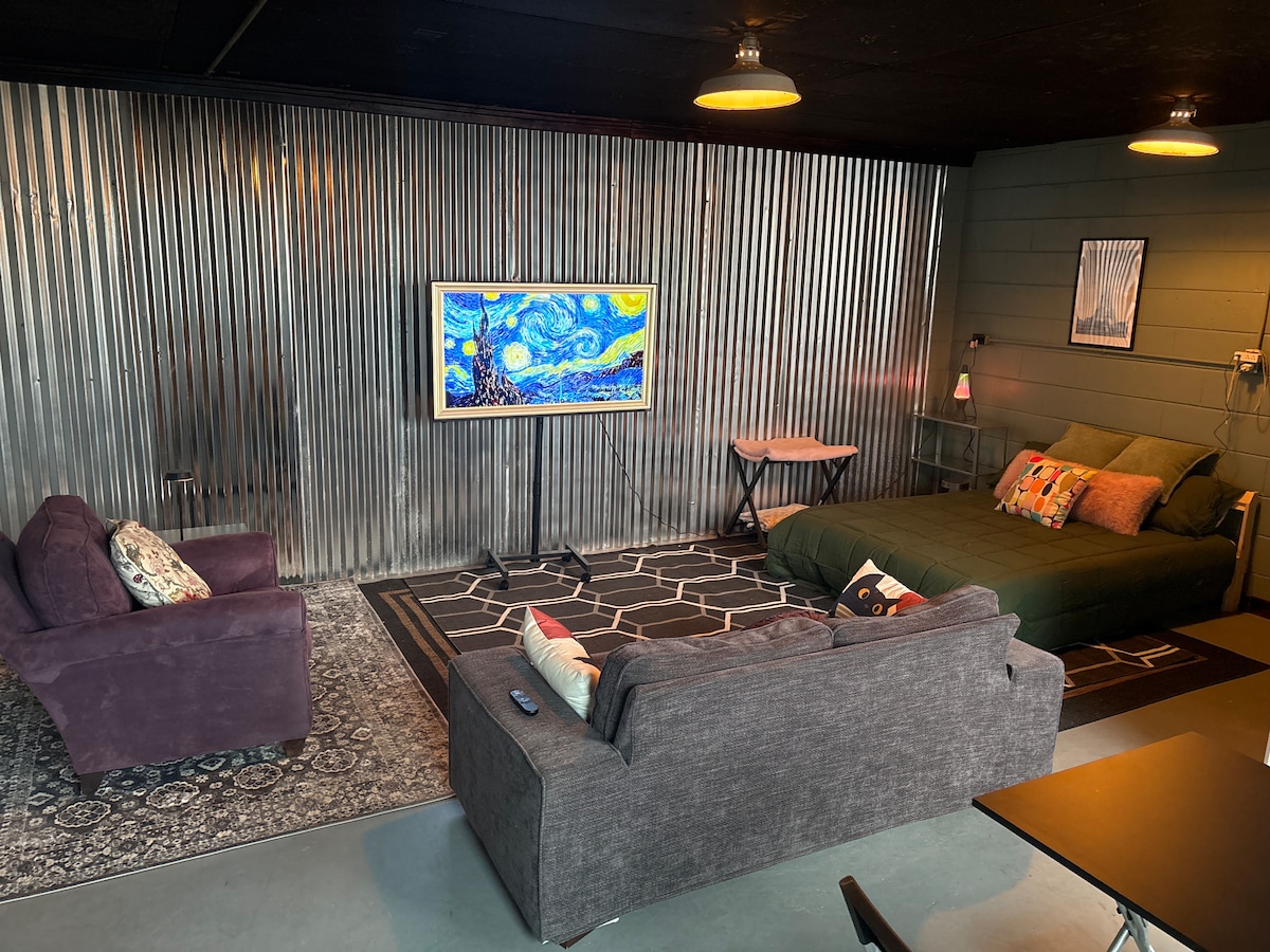 Este espaço único e elegante é uma prateleira de topo! Originalmente uma galeria, agora com tetos lofted, cadeiras MCM, 7 vitrais, eletrodomésticos premium - Kitchen Aid+Sub Zero, ótimas pinturas, estéreo e toca-discos Marantz, tapete West Elm, futon, centro de entretenimento. Cama queen com cabeceira personalizada, duas televisões de 60". Também bancadas de carvalho sólido, cafeteira e friso. Cortinas blackout, máquina de lavar/secar roupa, 1,5 casas de banho com bidé Toto e pisos de madeira, assentos de mesa de jantar 6. Requer passos para entrar