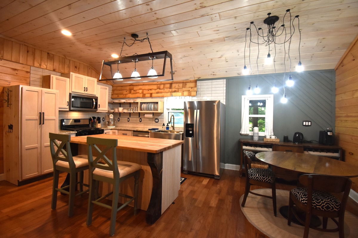 Relaxe e desconecte-se em nossa cabana recém-construída cercada por floresta e um lago mineral que atrai veados, pássaros e outros animais selvagens. Esta cabana rústica contemporânea tem uma cozinha totalmente abastecida, dois quartos confortáveis com camas king size e uma cama queen size. Os prazeres internos incluem uma seleção de jogos, uma lareira a gás, uma TV Roku HDTV de 65 polegadas e um violão Martin. Um espaçoso deck ao ar livre com lareira de madeira, TV Roku HDTV de 65 polegadas, churrasqueira a gás, amplos assentos ao ar livre e uma banheira de hidromassagem de 6 lugares.