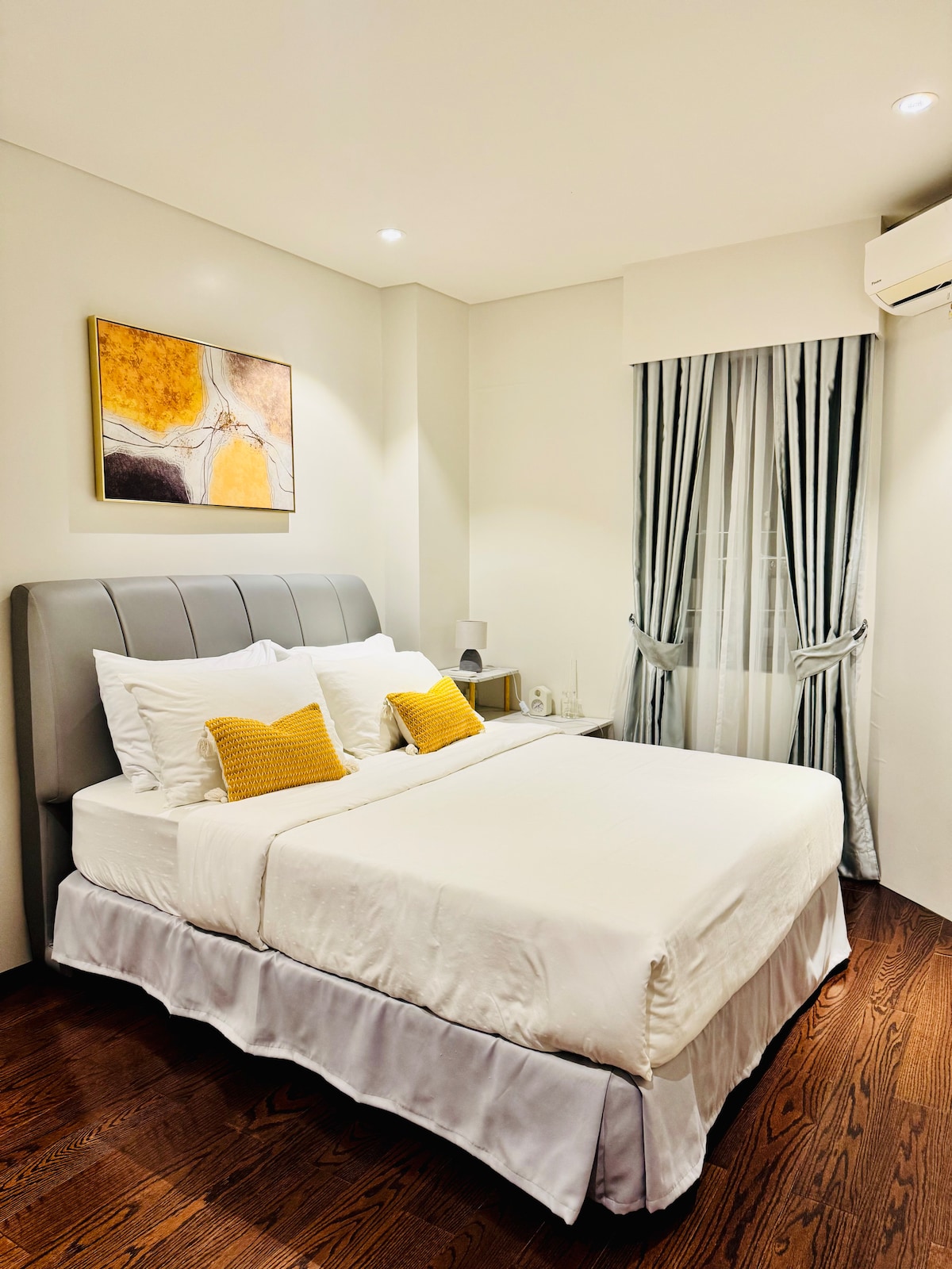 Executive studio for 2 people 15 minutes to Airport Quality Queen Bed Free Drinking Water-Japanese Dispenser Wi-Fi/SmartTV/Free Netflix Lockable Safe Smart Lock access Hot Shower, Bidet Fully Equipped Kitchen Balcony,Seaviews&Breezes Gordon Ramsay/Japan/Korean Restaurants,Concierge,Pool,24hrSecurity Supermarket,7/11,Bakery,Starbucks,McDonald’s,Pharmacy,ATMs 400m walk to Beach, Beach Passes Php350/person daily NOTE:Up to 16 hr daily Construction/Noise is next door. Discounted daily rate is 30%