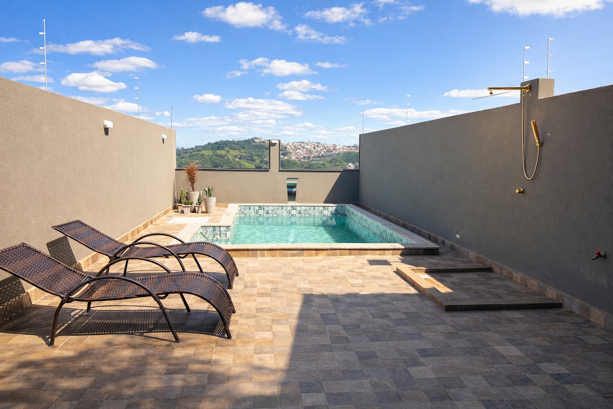 Lindo espaço para descansar e relaxar na piscina com uma vista incrível da cidade e desse espaço verde. Ótima para um churrasco em familia, e bronzear na piscina. Sejam bem vindos a Casa da Dani.