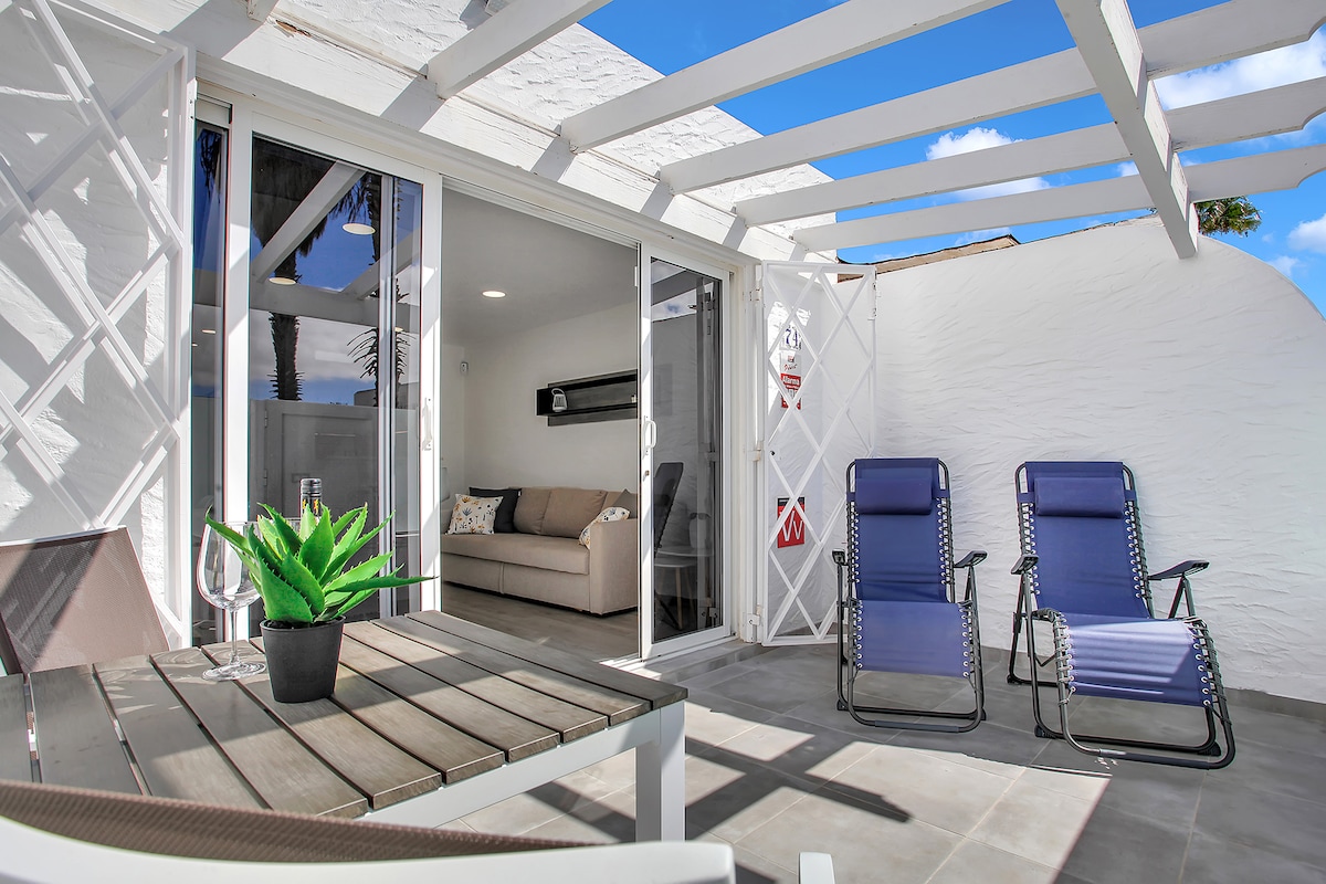 Localizado numa zona muito tranquila, a 2 minutos da praia chamada Sunset Beach e do centro comercial Bell Tower. Possui uma entrada separada através de um pequeno jardim comum e um terraço/pátio privado com exposição sul/leste. Casa mobilada com um toque exótico e cores claras, a cozinha está equipada com um pequeno frigorífico e forno e a sala de estar com televisão. Está localizado a 1 min da estação de guagua, a 10 min do centro de Corralejo e a 3 min do ponto de surfe de Corralejo.