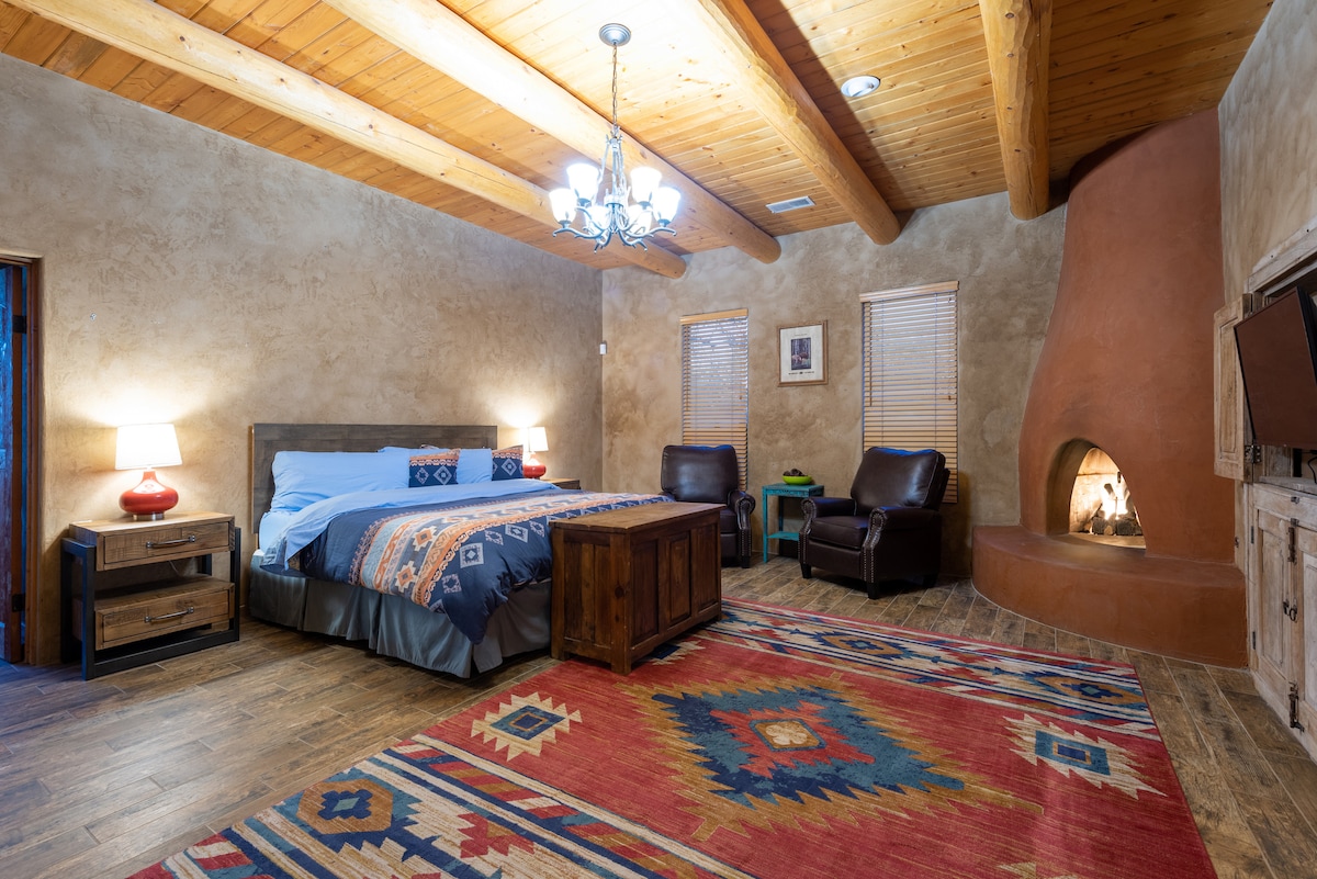 Welcome to our true New Mexican Adobe casita located in the North Valley of Albuquerque! Adjoined to our larger adobe main house, this charming little home boasts viga ceilings, a beautiful sunroof, brick floors, classic Spanish tilework, wood burning fireplace, and a stunning loft where the sunrise over the Sandia Mountains can wake you each morning. Off the beaten path and surrounded by rural land, horses, and blooming cottonwoods, our casita is an ideal place to unwind and recharge.