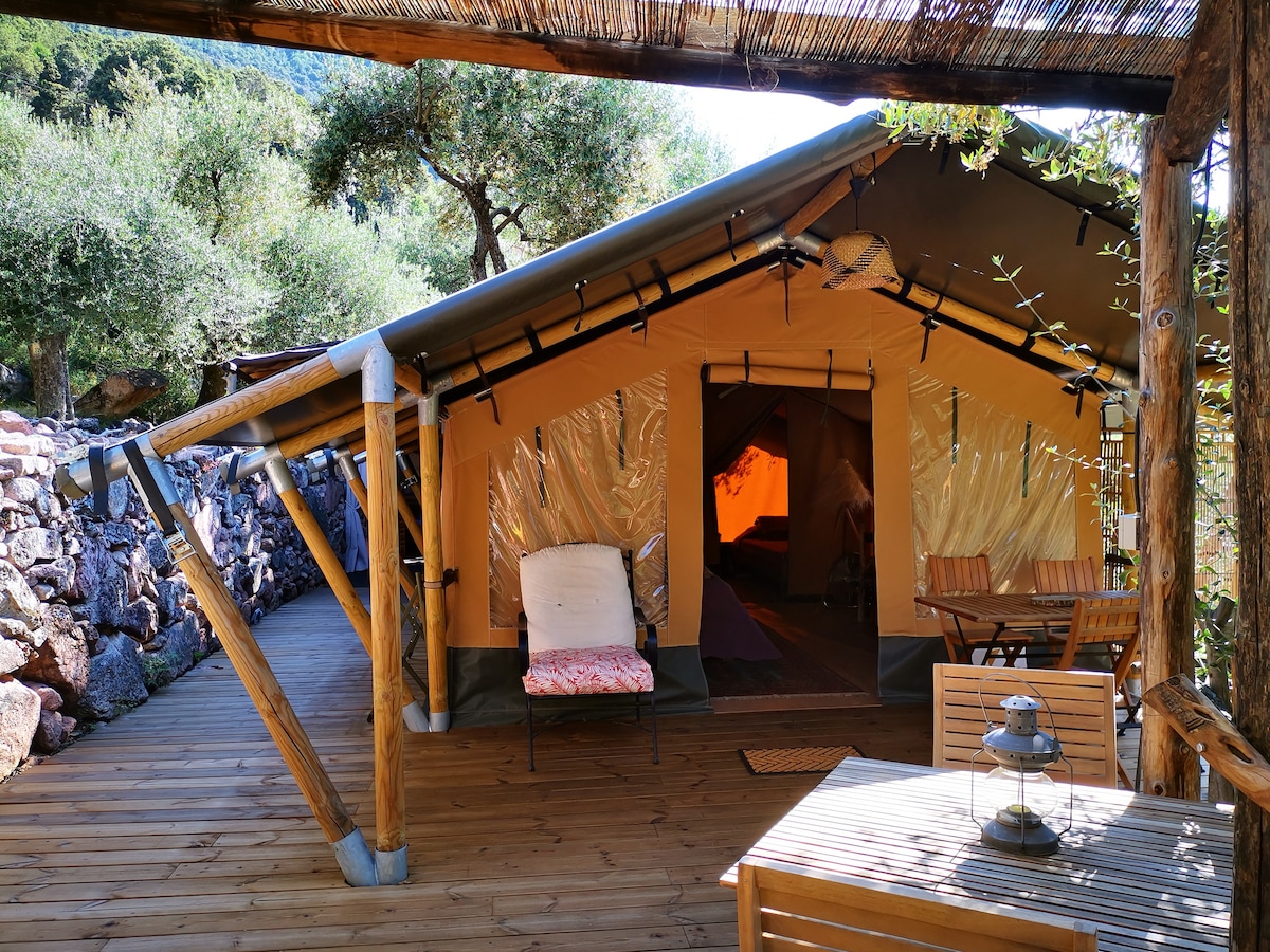 Tente lodge sur une grande terrasse en bois au milieu des oliviers A l’intérieur 2 chambres une de 14 m2 avec un lit en 140 ,l'autre avec 2 lits en 90.A l’extérieur un auvent de 10m2 pour le coin repas ,une cuisine d'été équipée, une sdb avec douche et vasque,un wc séparé. accés privatif à la rivière à 400 m en contrebas. A proximité de l oliveraie les chalanches de Piana,la forêt d'Aitone ,la reserve de Scandola.Le village d'Ota se trouve à 500 m