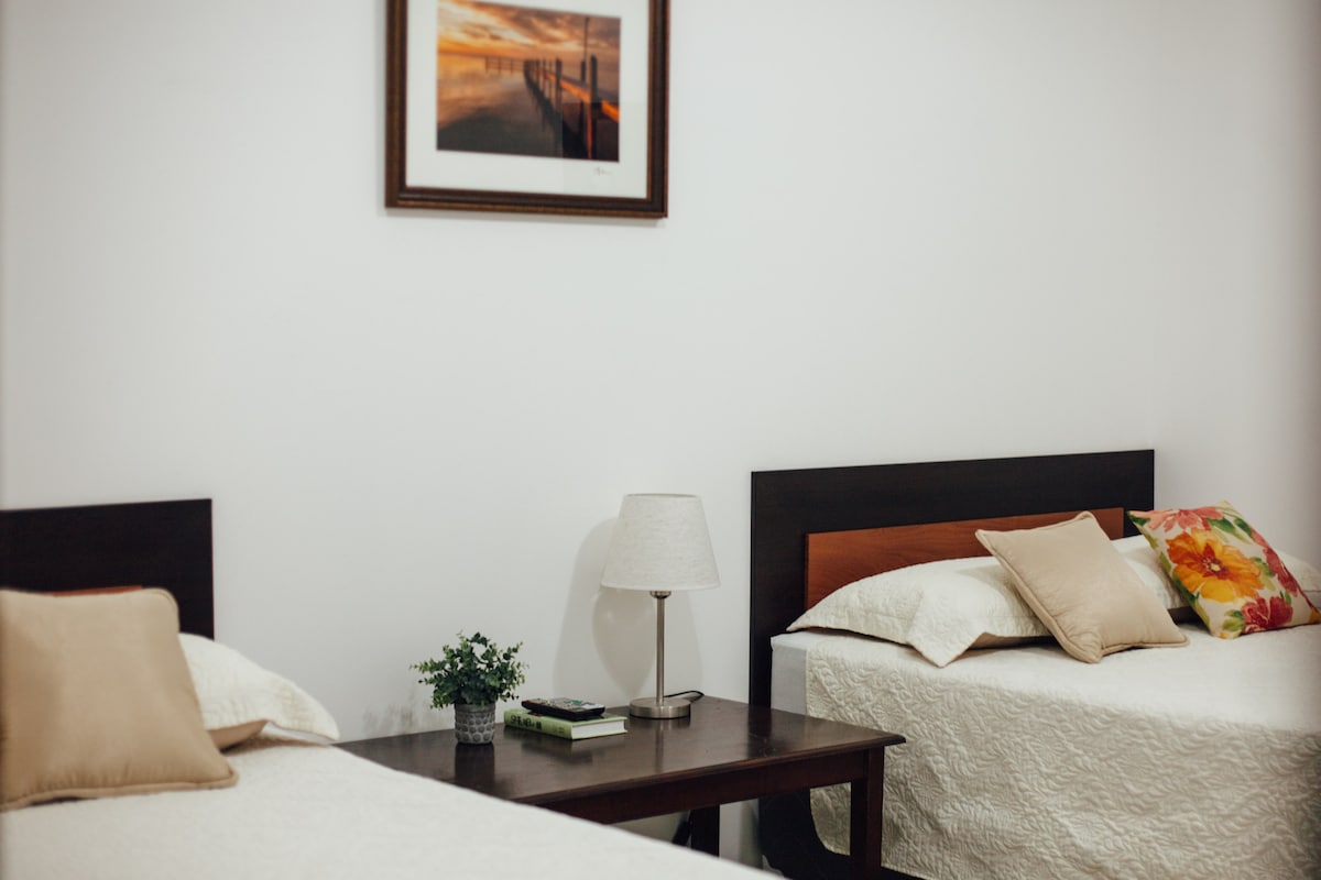 Nosso quarto é privativo e tem duas camas Queen, um banheiro amplo e privativo com água quente, uma TV LED de 32" com cabo, armário, Wi-Fi e ar condicionado. Estamos localizados perto do City Mall, da Zona Viva, da Estação Rodoviária Grand Central, do Copantl Hotel & Convention Center, de hospitais, bancos, do centro da cidade, entre outros. Temos também uma usina de energia.