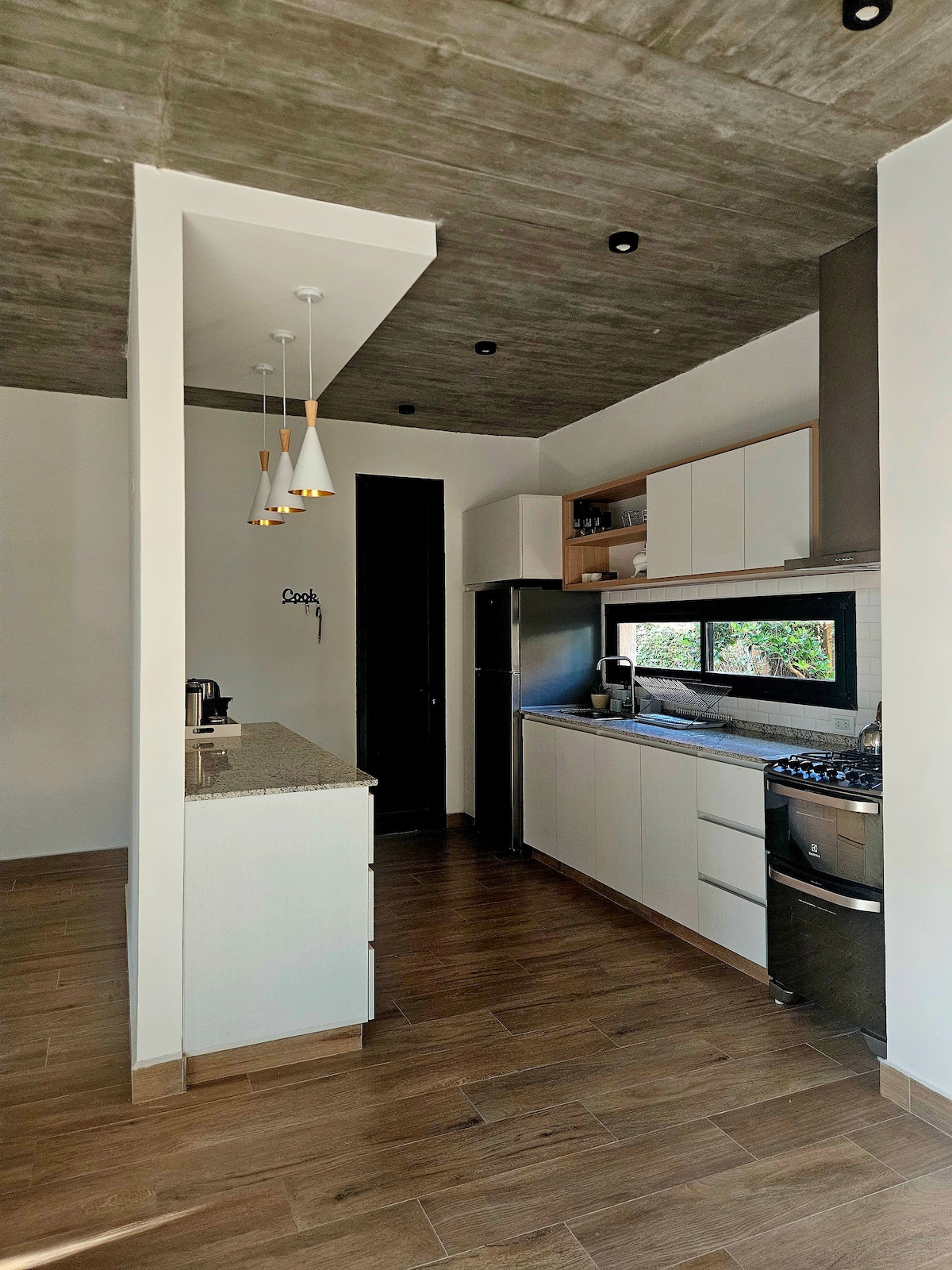 Incrível Micro Casa de Concreto em meio à floresta, respeitando a natureza do local, ambiente único com uma cama queen size, mesa de escritório, 2 cadeiras e Wi-Fi. Banheiro com chuveiro, pia, vaso sanitário. Kitchenette com pia, fogão elétrico, microondas e geladeira com freezer, NÃO é para cozinhar. Muito iluminada com o mar a 700 metros e o centro comercial a 600 metros. Esta bela casa está escondida atrás da casa principal com total privacidade e autonomia. Churrasqueira externa para uso comum do local. Bem-vindos!