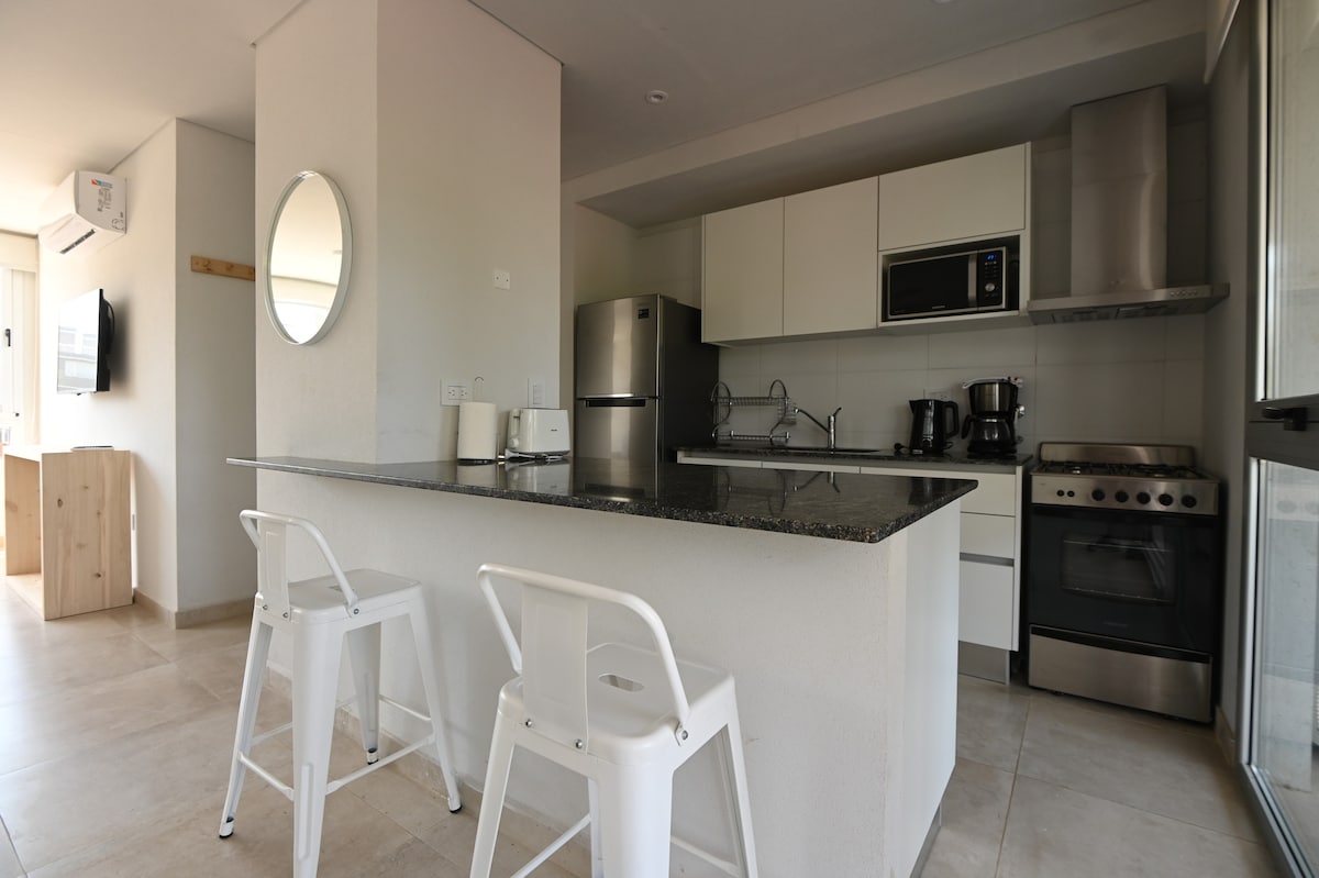 Apartamento novo para 4 pessoas com uma excelente localização, a apenas 200 metros do mar, a 100 metros de Chiozza e a 200 metros da Av. San Bernardo (área com uma variedade de cozinhas) tem: * TV na sala de estar. * Ar condicionado na sala. * Wi-Fi /televisão por cabo. * Micro-ondas, torradeira, liquidificador, etc. (lençóis não incluídos)