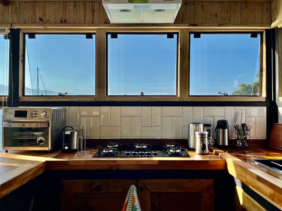• A Casa Flutuante comporta confortavelmente até 4 pessoas; • Possui uma cozinha moderna equipada com todos os utensílios necessários para o preparo de todas as refeições; • Um banheiro luxuoso com jacuzzi e ducha • Quarto com uma cama de casal, ar condicionado, televisão Smart 55 polegadas, escrivaninha para home office, cômoda, e varanda privada com duas poltronas • Sala equipada com ar condicionado dois sofá cama • Internet Starlink; • Todas Tomadas são 220v