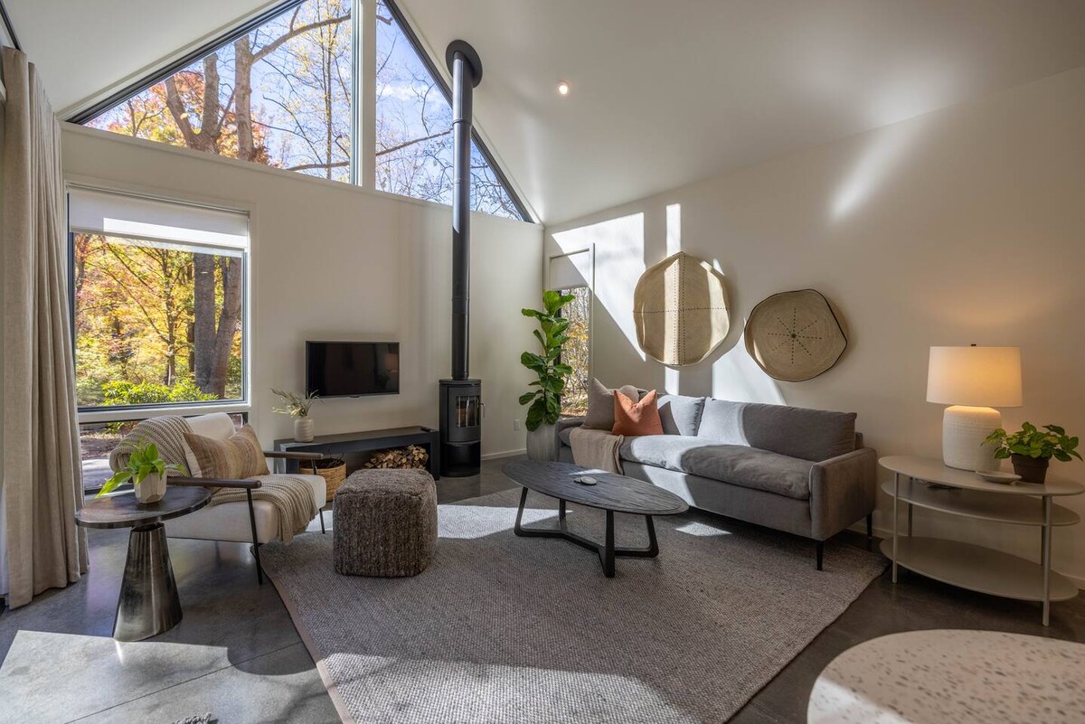 Asheville está a chamá-lo de volta - faça parte do retorno Asheville é aberta e mais vibrante, resiliente e determinada do que nunca — recentemente nomeada como um dos principais destinos para 2025 pelo Forbes Travel Guide e pelo The New York Times. A nossa casa de montanha contemporânea de luxo-romântico está situada em Fairview, NC. Apenas cerca de 14 milhas (aproximadamente 22 minutos) de carro até ao centro de Asheville. Rodeado pelos sons da natureza, completo com banheira de hidromassagem privada ao ar livre + lareira a gás e todos os confortos da vida na montanha.