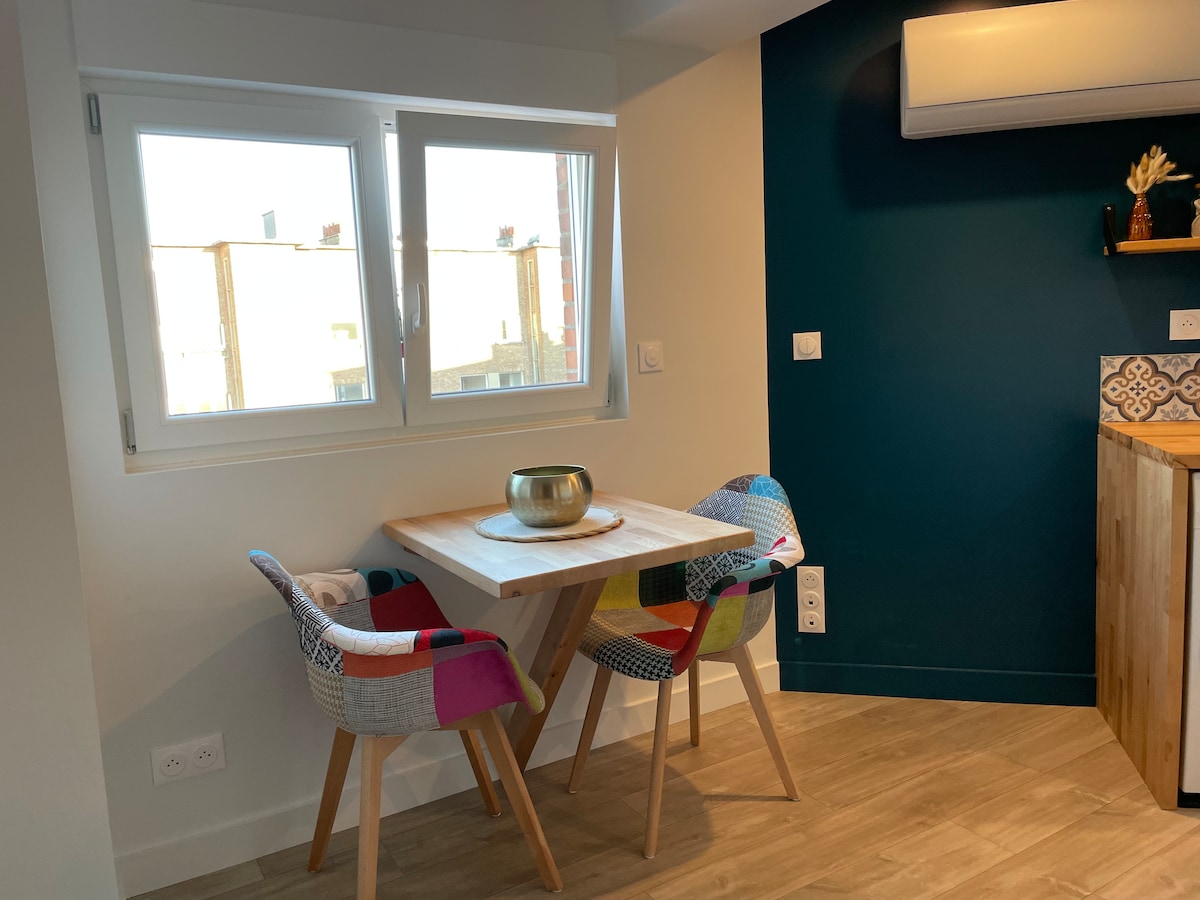 Bem-vindo ao Studio Le Plumard Bleu. Ideal para trabalhadores ou casais, estacionamento gratuito na rua, a 3 minutos da rodovia, a 10 minutos a pé da estação de trem, ônibus gratuito a 50 metros leva você à praia (C3). Bairro tranquilo, perfeito para teletrabalho (wifi). Estúdio luminoso (com persianas) localizado em um edifício da reconstrução totalmente renovado (térmico e funcional) e classificado com 2 estrelas. Ele se destaca por seu design que combina espaços sob medida e uma decoração elegante e cintilante.