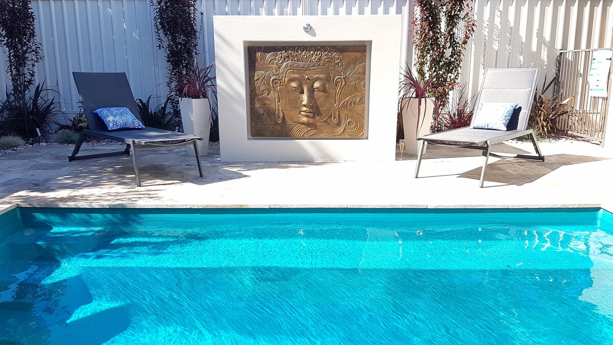 Esta vila elegante e tranquila permite que você e seu bebê de pele* tenham espaço para relaxar, descansar e rejuvenescer. Toques de luxo, incluindo lençóis de bambu 1000TC, cama king deluxe, TV de 64 polegadas, lounge de designer e sofá-cama ao ar livre com vista para o jardim para garantir que você se sinta tão relaxado quanto você é cuidado. Desfrute da reclusão, sons da vida selvagem e espaço verde, a poucos minutos das comodidades de Dunsborough, praias intocadas para cães e surf de qualidade, em uma região abençoada com vinícolas 5 estrelas, restaurantes, galerias e produtos locais excepcionais.