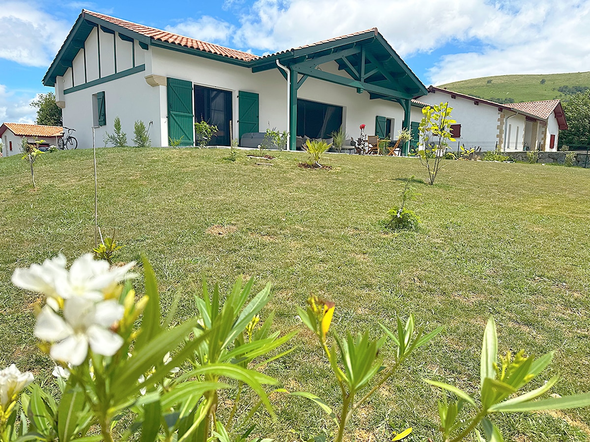 Casa de charme, estilo basco, situada em uma área verde com uma vista excepcional. Equipada com uma piscina de 10 x 5, spa para 5 pessoas Quadra de petanca Espreguiçadeiras, móveis de jardim, aquecedor externo, guarda-sol. Cozinha ao ar livre com churrasqueira, pia e geladeira. Pomar, terreno arborizado com vista para a montanha. Música Suíte principal no térreo com cama de 180 cm, closet, banheiro e toalete separados. 3 quartos, um com sacada, banheiro, toalete no andar de cima. Cozinha equipada Fogão a lenha Roupa de cama fornecida A partir de 220 €/noite