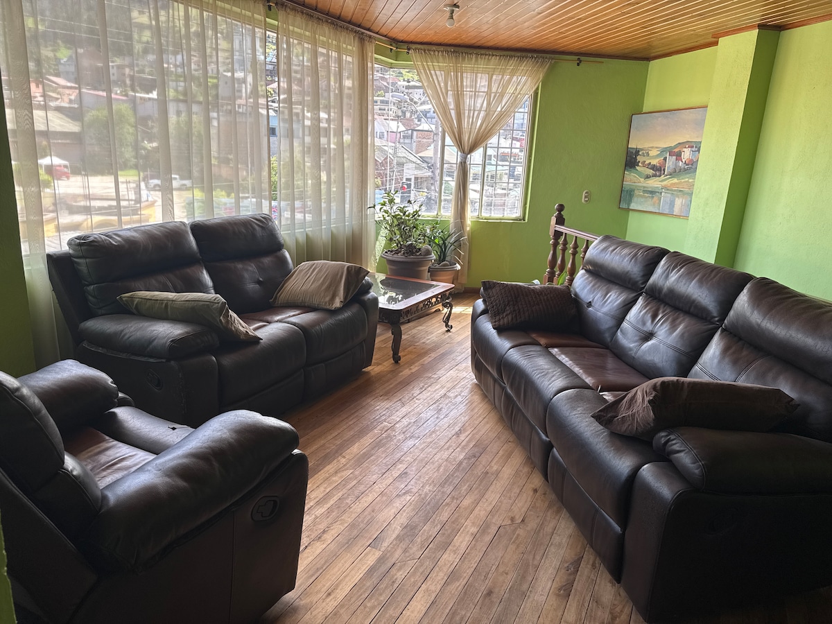 Desfrute da sua estadia na icônica cidade de Cuenca, em um apartamento com todas as comodidades que o farão sentir-se em casa, localizado no famoso miradouro Turi nos arredores da cidade, rodeado pela natureza e tranquilidade, enquanto desfruta de uma ótima vista da cidade, dentro de uma casa segura com ambiente familiar.