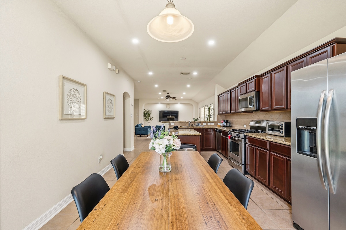 Bem-vindo à sua escapadela em grupo perfeita! Esta espaçosa casa de 5 quartos dispõe de 9 camas, uma elegante sala de jantar, uma grande área de estar em plano aberto e uma divertida sala de jogos, ideal para famílias, amigos ou convidados de casamento. A 🌟 apenas 3 minutos do belo Safari Texas Ranch. 🌟 Apenas 15 minutos da vibrante Chinatown e zona vietnamita de Houston em Bellaire, onde pode explorar a incrível comida asiática. Quer esteja a explorar ou a relaxar, esta casa oferece conforto, conveniência e espaço para todos desfrutarem!