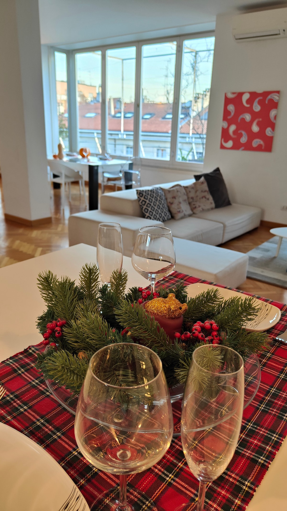 Um apartamento dentro de um prédio vintage. Apartamento amplo e espaçoso com 4 quartos, cada um com cama de casal e casa de banho privativa. Dois quartos têm uma casa de banho privativa. Cozinha completa e organizada que é usada como sala de jantar. Smart TV em 3 quartos, Internet Wi-Fi de alta velocidade em fibra ótica (1 GB) Todos os modos de transporte estão sob a casa: Estação de comboios, metro, todos os autocarros para todos os aeroportos, táxis e partilha de bicicletas