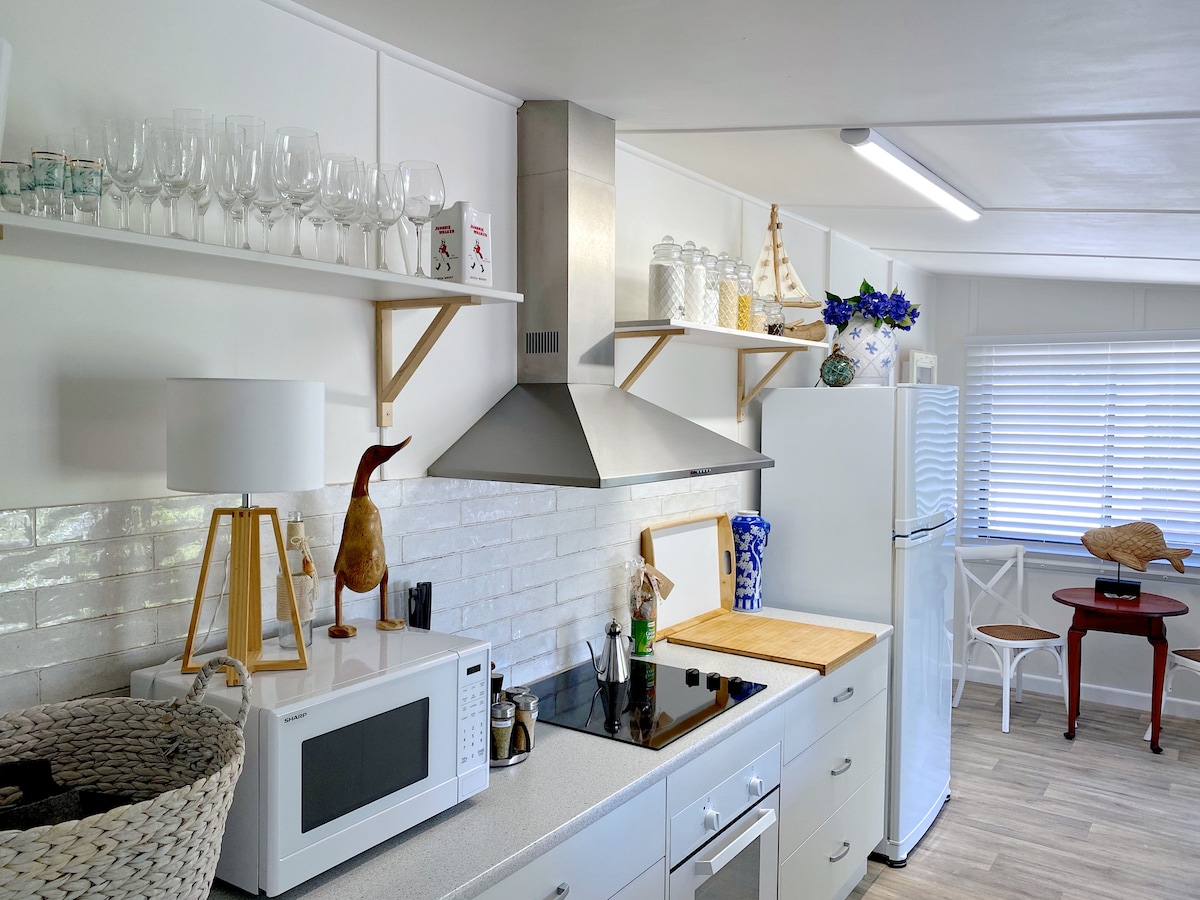Wi-Fi ilimitado! Em frente ao riacho e à passarela da praia, esta linda casa de campo fresca é uma escapada romântica ideal, um retiro da cidade ou o lugar ideal para aquelas férias em família. Os móveis são elegantes, confortáveis e com tema costeiro. Há uma área de estar maravilhosa para relaxar. A cozinha é deliciosa com muitos eletrodomésticos, louças e copos. Depois de caminhar para trás do seu mergulho, refresque-se no chuveiro do jardim e sente-se e relaxe na bela área privativa ao ar livre.