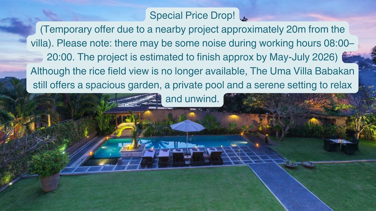 Uma Villa Babakan – Aluguer Mensal Disponível Redução de preço especial! (Oferta temporária devido a um projeto nas proximidades, a aproximadamente 20 m da villa. Atenção: pode haver algum ruído durante o horário de trabalho das 08:00 às 18:00. Estima-se que o projeto termine até maio de 2026.) Embora a vista para o campo de arroz já não esteja disponível, a Uma Villa Babakan ainda oferece um jardim espaçoso, uma piscina privada e um ambiente sereno para relaxar e descontrair.