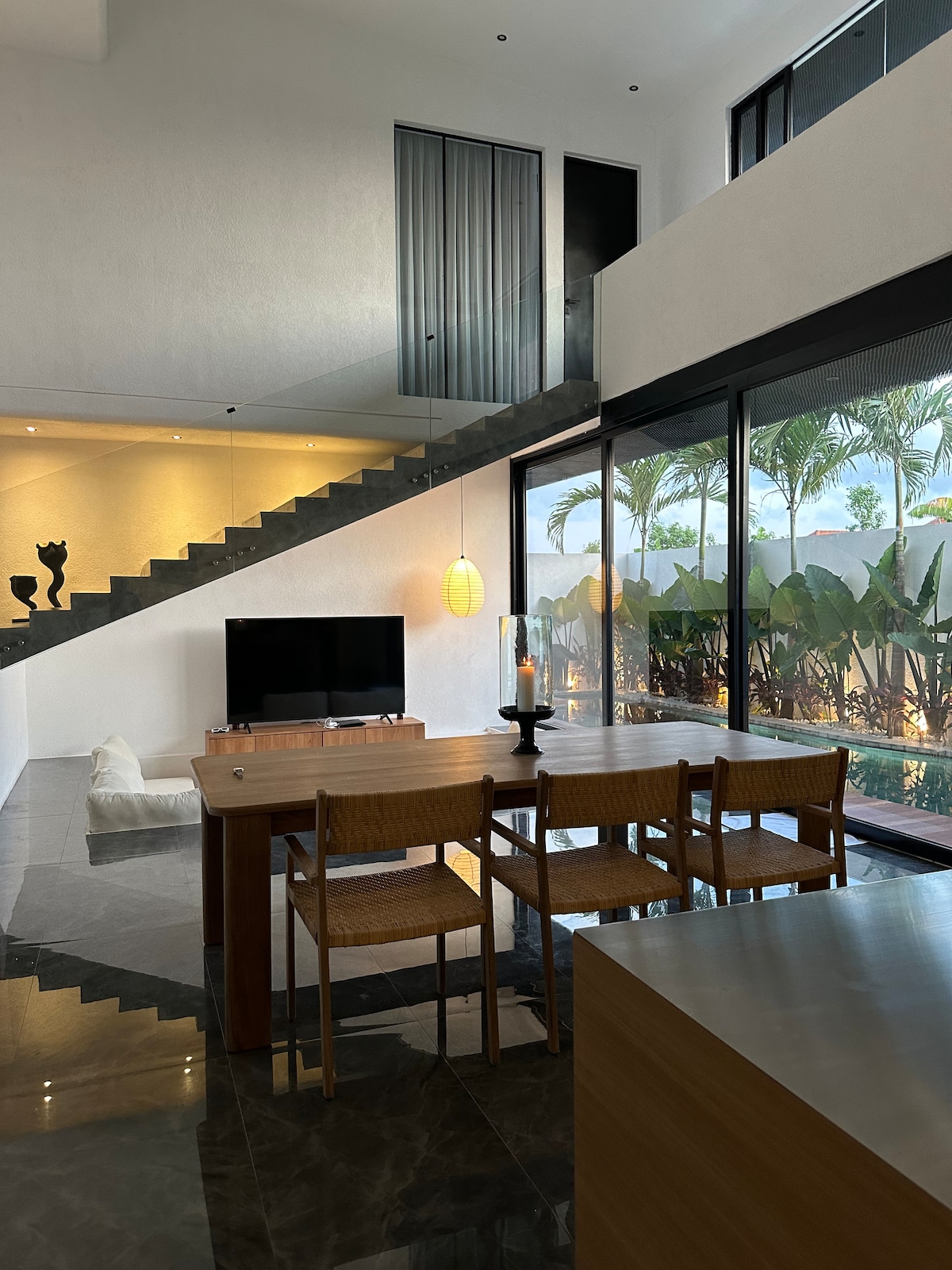 A nossa residência de dois andares capta a essência da serenidade, com amplas áreas de estar, suíte principal espaçosa com banheira privativa, casa de banho e closet, ilha de cozinha totalmente equipada e piscina privada rodeada por um oásis tropical exuberante. Oferecemos mais do que uma estadia; criamos experiências. Desfrute de uma massagem relaxante na villa ou de noites de cinema com um projetor e pipocas. Cada momento é organizado para rejuvenescer e inspirar, criando uma estadia exclusivamente sua.