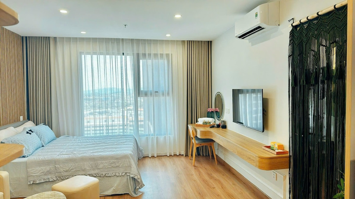 O apartamento é luxuosamente concebido, moderno com espaço aberto, vistas poéticas tanto para o lago como para a cidade cintilante. Cozinha totalmente equipada com utensílios de cozinha básicos, forno conveniente, pronta para refeições deliciosas. Pode relaxar com a televisão de ecrã grande disponível Netflix ou desfrutar de um copo de vinho no seu próprio espaço acolhedor. Em particular, também tem acesso gratuito a uma piscina moderna e ginásio no local, ajudando-o a manter-se ativo e relaxante durante a sua estadia.