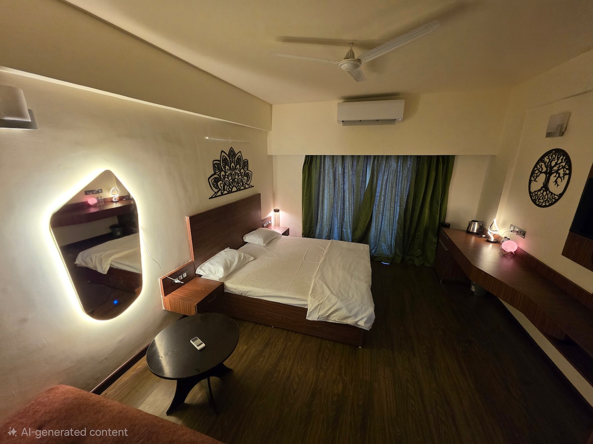 Bem-vindo ao Melody by AariaHomez, um deslumbrante apartamento de luxo familiar aninhado no coração das montanhas, perfeito para uma escapadinha romântica ou aventura solo. O apartamento fica a apenas 10 minutos do shopping Pacific Rajpur Road e a 60 minutos da rainha das colinas Mussorie. - Cama king size confortável com lençóis premium - Oferece uma cozinha para suas necessidades culinárias - Banheiro moderno com itens essenciais fornecidos. - Varanda privativa para desfrutar do seu café da manhã - Smart TV e Wi-Fi de alta velocidade