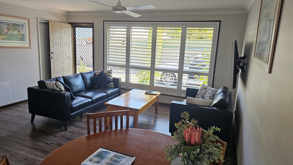 A 300 m da bela praia de Shoal Bay, moradia de um só piso recentemente renovada num pequeno complexo de 3. Estacionamento à porta. Ótima localização para caminhar, andar de bicicleta, jogar golfe, praticar SUP e caiaque. Fácil caminhada de 3 minutos até à bela e icónica praia de Shoal Bay, restaurantes e comodidades. Armazenamento fácil para bicicletas, caiaques, pranchas de SUP na garagem. Bancos de mesa e banco no exterior para refeições. Autocarro do Aeroporto de Sydney ou Newcastle para Shoal Bay, tornando estas férias disponíveis para quem viaja sem carro.