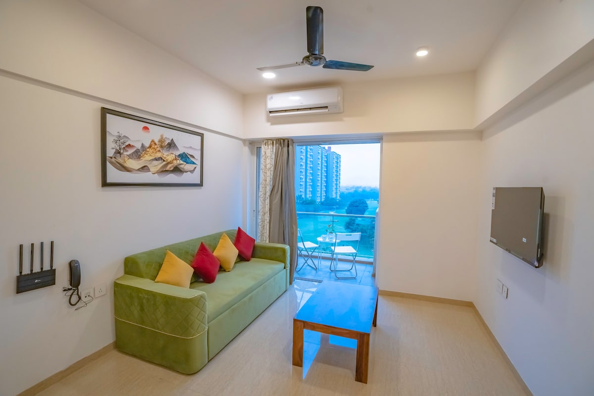 Welcome to a calm and comfortable 1BHK studio ideal for couples, families, solo travelers, friends, and remote workers. Whether you’re here for a quiet weekend, a work-from-home stay, or a longer peaceful break, this home offers the right balance of comfort, greenery, and convenience. The private balcony overlooks lush green surroundings near the golf course. With fast WiFi, OTT apps, and a quiet gated environment, it’s easy to slow down and feel at home.