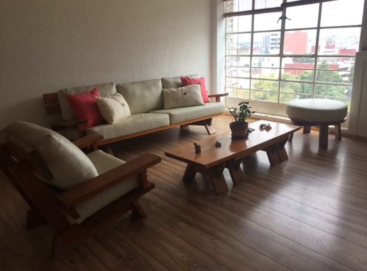 Apartamento de 47 metros quadrados com espaços muito bem aproveitados, mobiliário moderno, perto de supermercados, bancos, restaurantes e um grande parque para desfrutar da natureza ou fazer exercícios. Transporte público (METRÔ E METROBUS) a poucas ruas. Está localizado na esquina da praça de touros México e do estádio Azul.