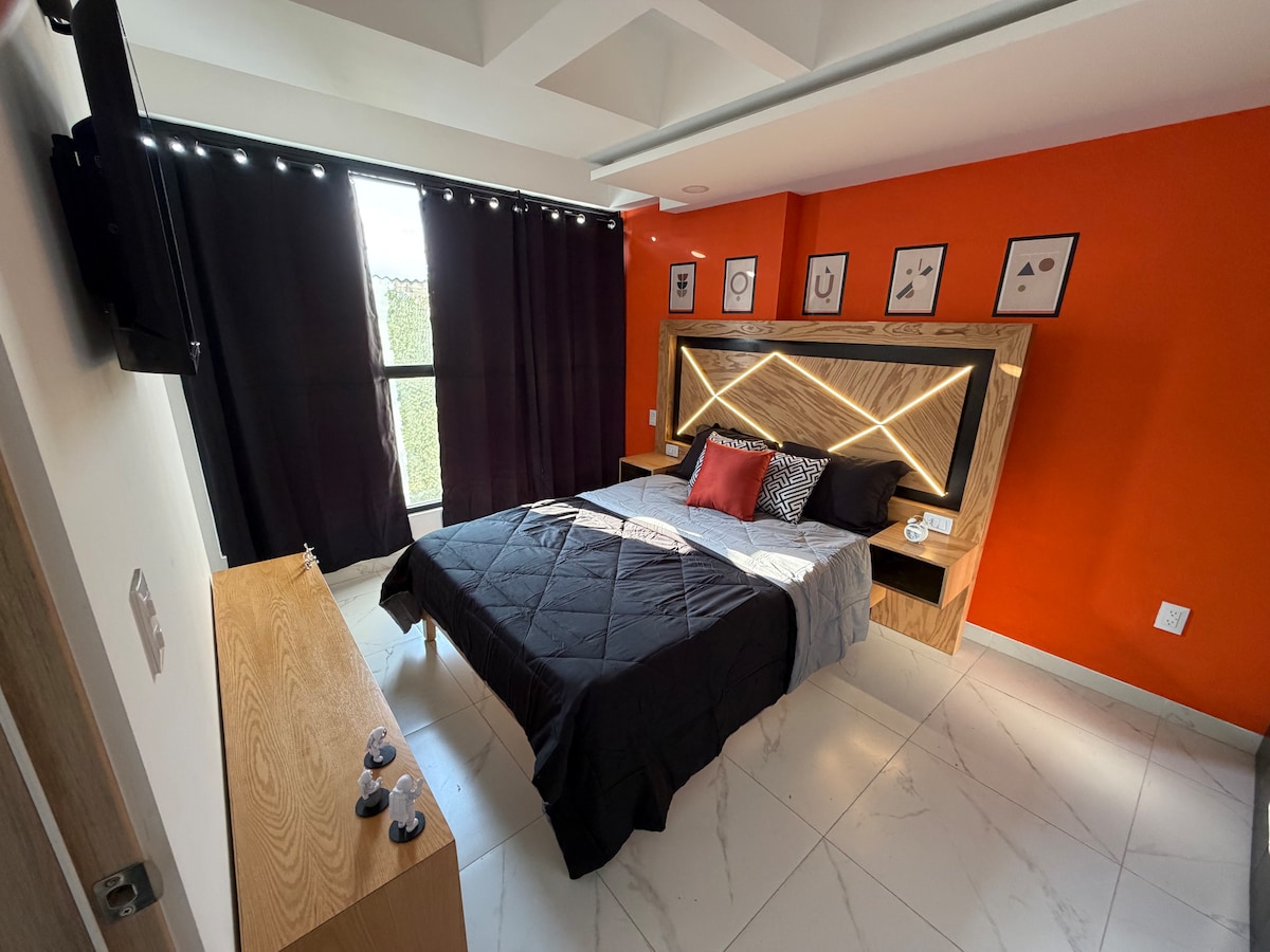 Hospédate en este céntrico Loft con fantástico jacuzzi privado, para uso exclusivo de nuestros huéspedes. Disfruta tu estancia en un ambiente amplio y agradable; donde te sentirás cómodo y relajado. Ideal para una inolvidable escapada romántica, viajes de negocios o para home office. Tendrás acceso a un lugar de estacionamiento independiente, con opción a dos. Escritorio con altura regulable: trabaja sentado o de pie.