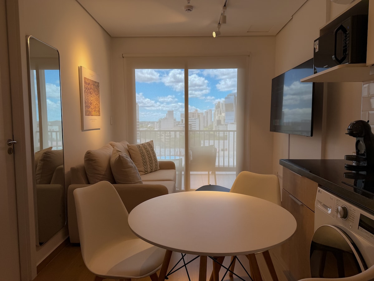 Just a short walk from Shopping del Sol. Near to el paseo La Galería, World Trade Center, business area. Located in Home Palace Tower Enjoy a bright living-room and a bedroom with a spacious king-size bed, plus the best city view from the balcony – catch beautiful Paraguayan sunsets and the neighborhood lights at night. Perfect for business or leisure – modern, clean, fast Wi-Fi, A/C, and a warm welcome.