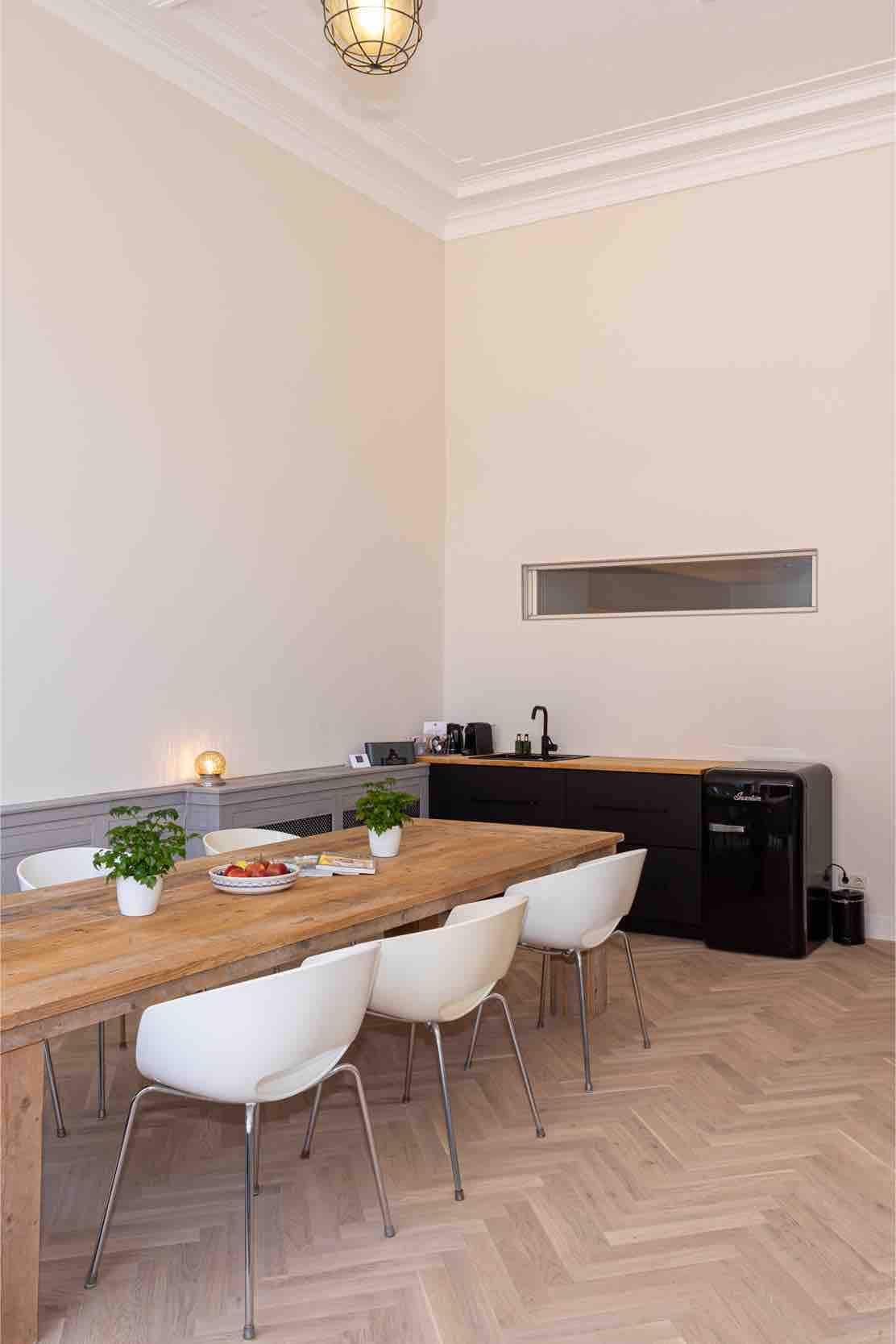 Situada numa rua residencial tranquila numa das melhores localizações de Haia, esta casa oferece um raro equilíbrio entre paz e proximidade. Saia e estará mesmo ao virar da esquina do famoso "Denneweg", com cafés e restaurantes. O apartamento foi concebido para garantir privacidade, com um quarto na frente e um segundo na parte de trás. Esta casa histórica modernizada tem um jardim que parece uma extensão do espaço de estar. À noite, a iluminação suave do jardim cria uma atmosfera acolhedora e convidativa.