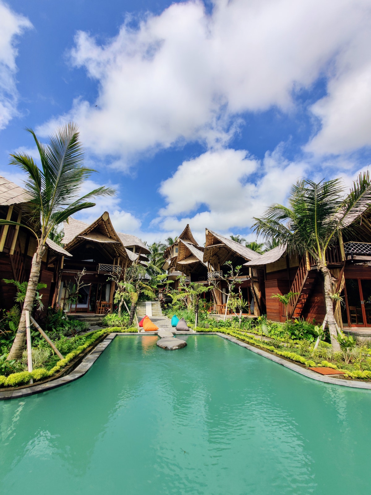 Uma casa 3bdr privada recém-construída para caçadores de um autêntico caráter indonésio e um sono confortável. Esta casa de madeira maciça de 150 anos está cheia de características agradáveis aos olhos. Situado num bairro tranquilo sem saída no topo de um desfiladeiro. Oferecendo muita luz natural graças às portas e janelas de vidro completas, o nosso interior moderno é leve e seco. A piscina longa e o terraço de ioga são um bónus. Um local perfeito para o nascer do sol, o Monte Agung e a observação de pássaros!