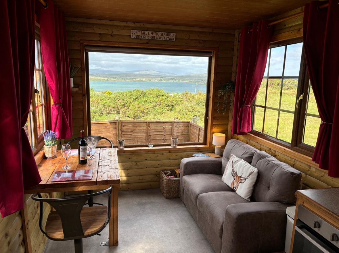 Cabana moderna situada em uma paisagem acidentada com vista para as montanhas e o mar. A 5 minutos a pé de uma praia imaculada. Desperte seus sentidos para os sons das ondas e gaivotas enquanto bebe sua xícara matinal e aprecia a paisagem dramática através da janela panorâmica com vista para a urze roxa selvagem. Desfrute do som do silêncio em seu pátio privado enquanto saboreia seu vinho e aproveita aconchego.