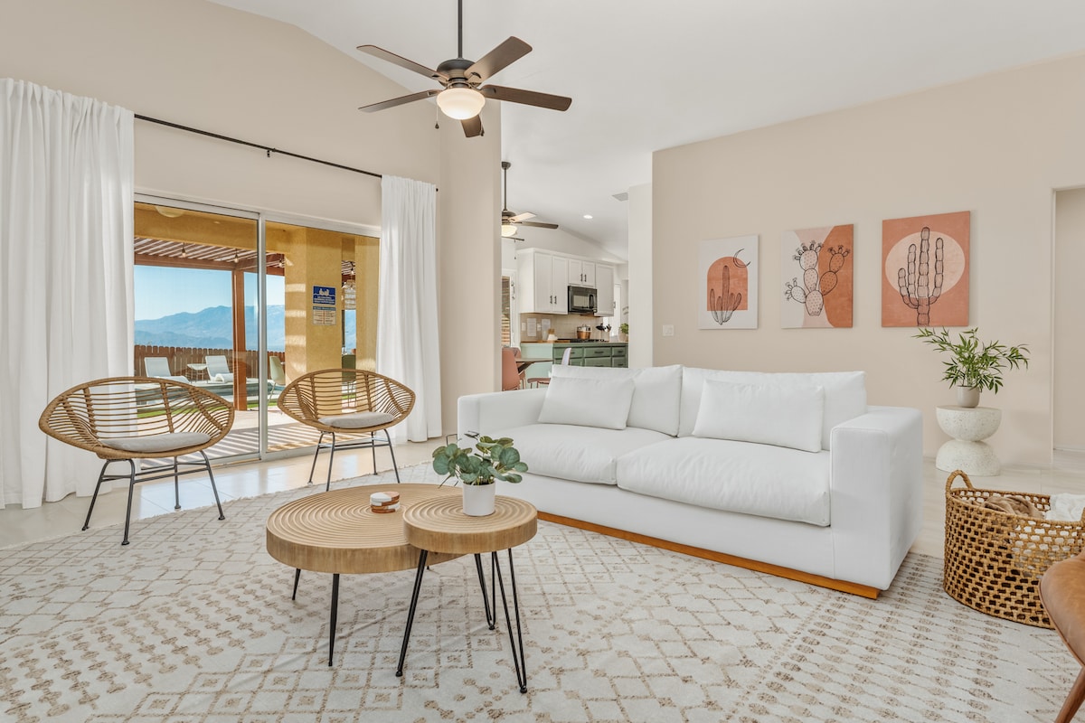 Bem-vindo ao Mountain View Retreat em Desert Hot Springs, onde pode desfrutar de belas vistas panorâmicas da montanha a partir do quintal, aproveitar o sol enquanto estiver numa piscina de água salgada/banheira de hidromassagem, desfrutar de jogos ao ar livre e ver o seu filme favorito num ecrã de projetor insuflável. Esta casa de 3 camas e 2 casas de banho com sala de estar/cozinha/sala de jantar de conceito aberto é um ótimo lugar para relaxar depois de jogar 18 buracos num campo de golfe nas proximidades ou para uma escapadela de fim de semana com a família ou amigos.