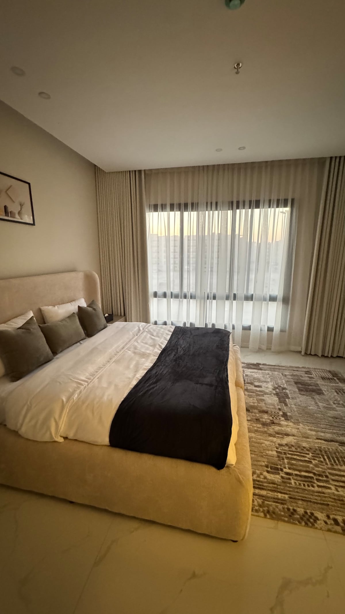 Desfrute de uma estadia perfeita num apartamento espaçoso e confortável com um quarto com uma cama grande e elegante, uma sala espaçosa com uma bela vista e uma cozinha totalmente equipada para um conforto completo. O apartamento está equipado com Internet de alta velocidade, uma televisão de 65 polegadas com Netflix e subscrição Shahid, bem como uma máquina de lavar roupa para facilitar a sua utilização. O apartamento está localizado num local tranquilo que lhe oferece um ambiente relaxante longe do barulho, tornando-o a escolha perfeita para famílias ou amigos que procuram uma estadia confortável que combine luxo e tranquilidade. Disponibilizamos um berço. Por favor, informe-nos no momento da reserva ou com bastante antecedência para podermos prepará-lo.