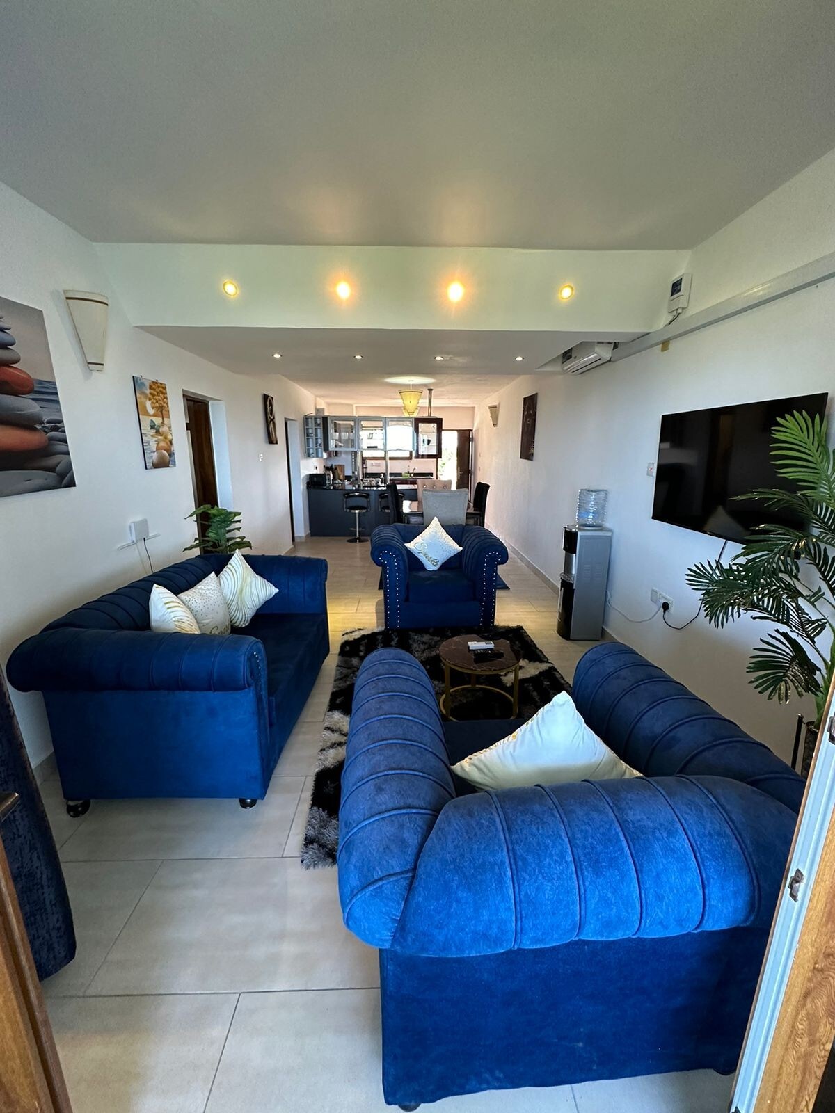 Bem-vindo à nossa bela penthouse localizada no coração de Diani, Quénia. Esta deslumbrante casa de 3 quartos possui um amplo terraço que oferece vistas deslumbrantes e está convenientemente situada mesmo atrás do Supermercado Chandarana, proporcionando fácil acesso a todas as suas necessidades diárias. Além disso, ficará encantado por saber que a bela praia de areia fica a apenas 5 minutos a pé! Temos 3 quartos, 2 (2 com casa de banho). Também temos um grande espaço de estar fora do terraço com sofás-cama muito confortáveis.