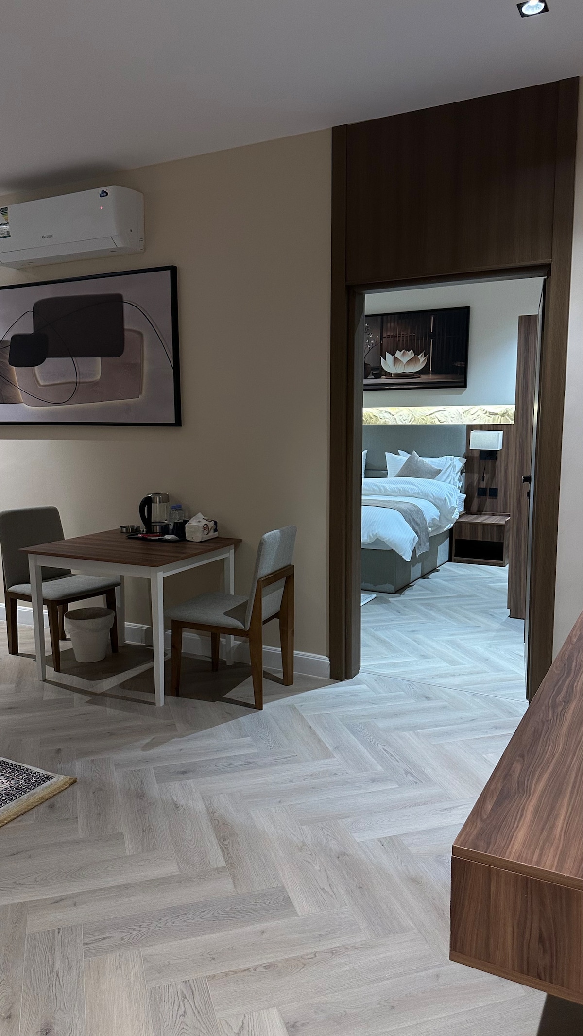 Suíte Real 🏨 Localização: Distrito de Hittin | Riad 📍 Localização privilegiada: perto de todos os serviços e eventos 🛍️🎢 Praça Saad: 3 min Riyadh Boulevard: 5 min Vale Laysen: 10 min Distrito Financeiro: 15 min Parque Riyadh: 13 min Aeroporto: 17 min Composição da suíte: Quarto + Sala de estar + Cozinha + Banheiro Serviços: TV de 85 polegadas, sofás confortáveis. Banheiro totalmente abastecido: sabonete, xampu, condicionador, escova de dentes Iluminação ajustável Geladeira, chaleira elétrica, micro-ondas
