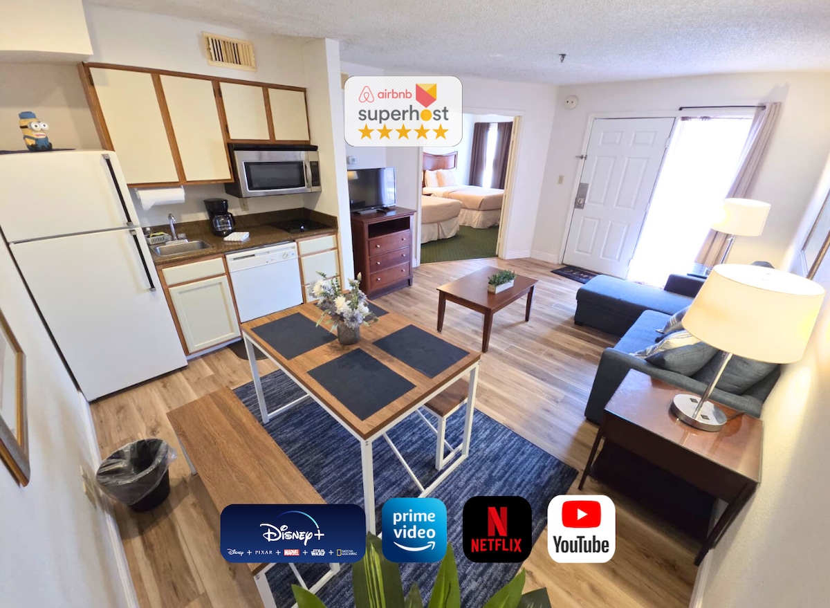 Bem-vindo à sua derradeira escapadela em família perto da Disney! Este espaçoso apartamento de 3 quartos está perfeitamente localizado a poucos minutos da magia da Disney. Concebida a pensar nas famílias, dispõe de dois quartos infantis com temas encantadores: uma aventura Toy Story e uma escapadela tropical inspirada em Moana, que certamente irão encantar os mais pequenos. Desfrute de acesso total a um parque aquático incrível, incluído gratuitamente, fazendo com que todos os dias pareçam férias. Quer esteja a descontrair depois de um dia nos parques ou a chapinhar