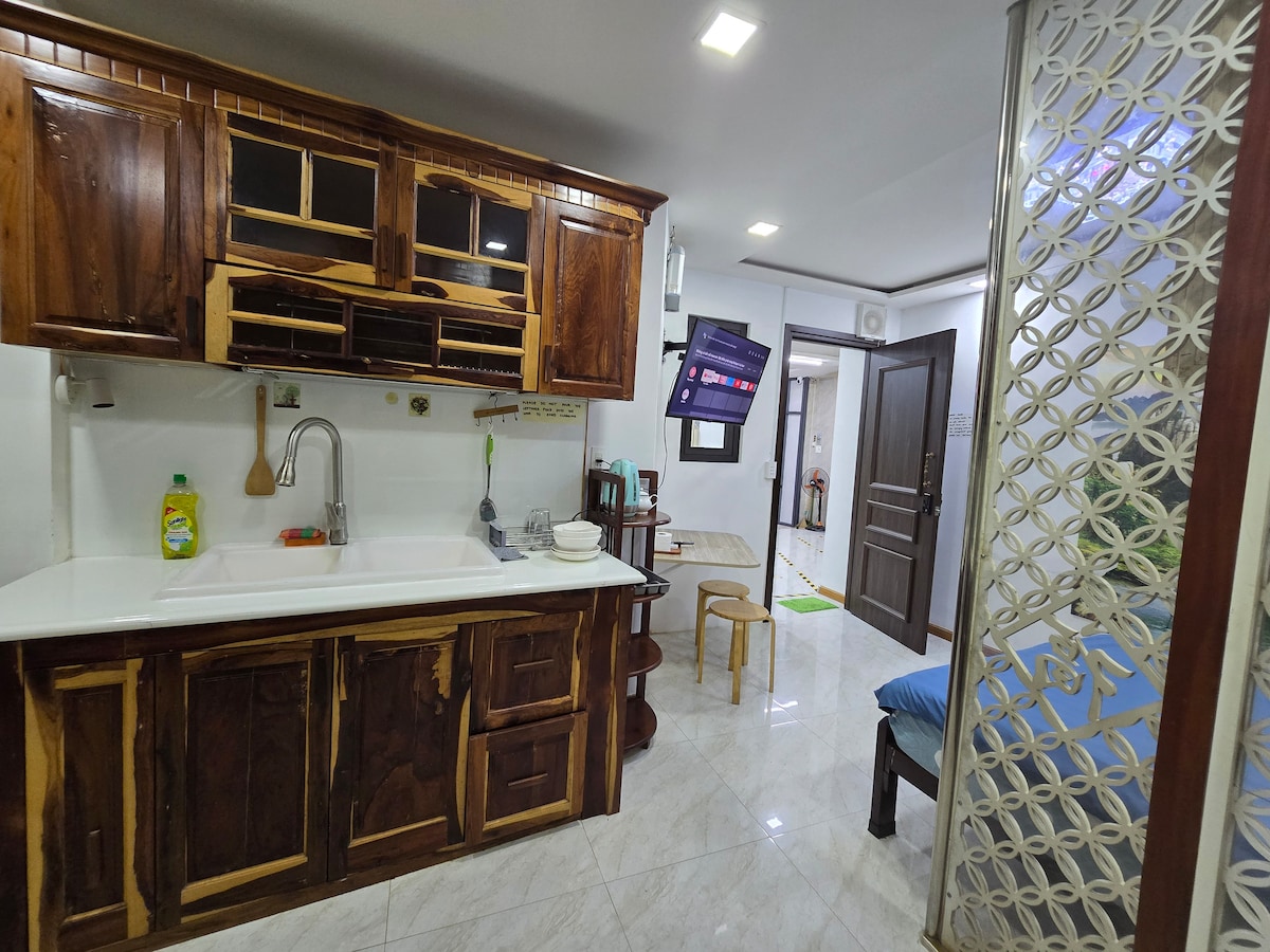 Bem-vindo ao nosso estúdio acolhedor e limpo no coração da cidade. Tem uma cama de casal, um frigorífico grande, um fogão elétrico, um micro-ondas, um exaustor, uma chaleira, uma mesa de jantar e uma televisão montada na parede. A cozinha de madeira inclui utensílios de cozinha completos. Casa de banho privativa com chuveiro e lavatório elegante. Equipado com ar condicionado, Wi-Fi forte e uma divisória decorativa. Ideal para estadias curtas ou longas.