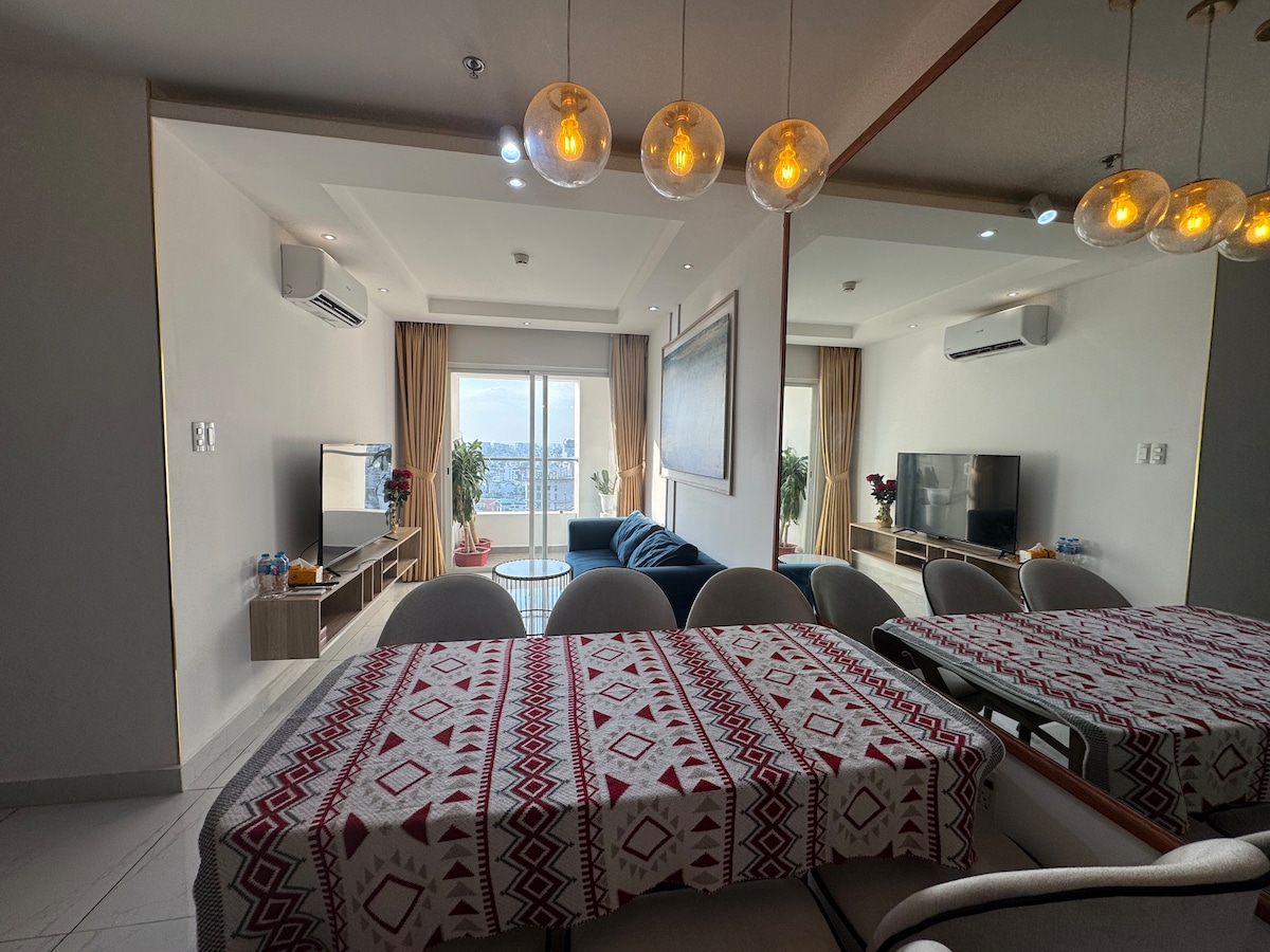 Apartamento espaçoso 87m2, 2 quartos, 2 casas de banho, mesmo no coração do Distrito 10, serviço completo e serviços públicos, vista para a piscina e vegetação arejada. A 10 minutos do mercado Ben Thanh e da rua Bui Vien West, a 7 km do aeroporto Tan Son Nhat. Perto do supermercado Coopmart e da Asian International School.