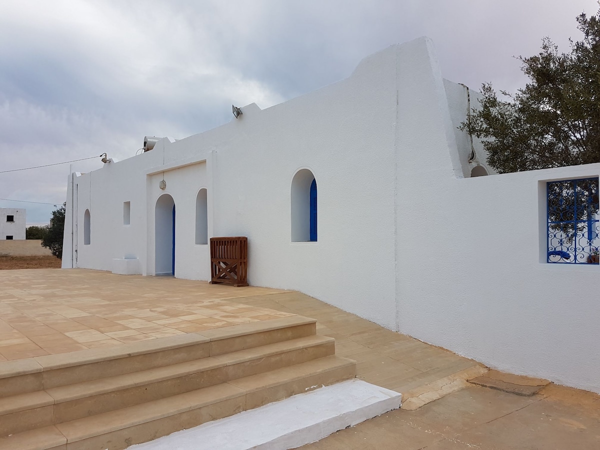 Bem-vindo à nossa vila sem vizinhos, virada para o sul, em uma área tranquila Ela tem uma grande piscina privada, uma piscina infantil, uma grande sala de estar, uma cozinha equipada, uma área de pérgula para relaxar, um churrasco, um canto aconchegante... Jogos de tabuleiro estão disponíveis para entreter você A 200 m da mesquita, e de carro: a 2 minutos do supermercado, a 5 minutos da praia e a 15 minutos do centro da cidade de Midoun e do shopping Bourgo Mall O carro é altamente recomendado