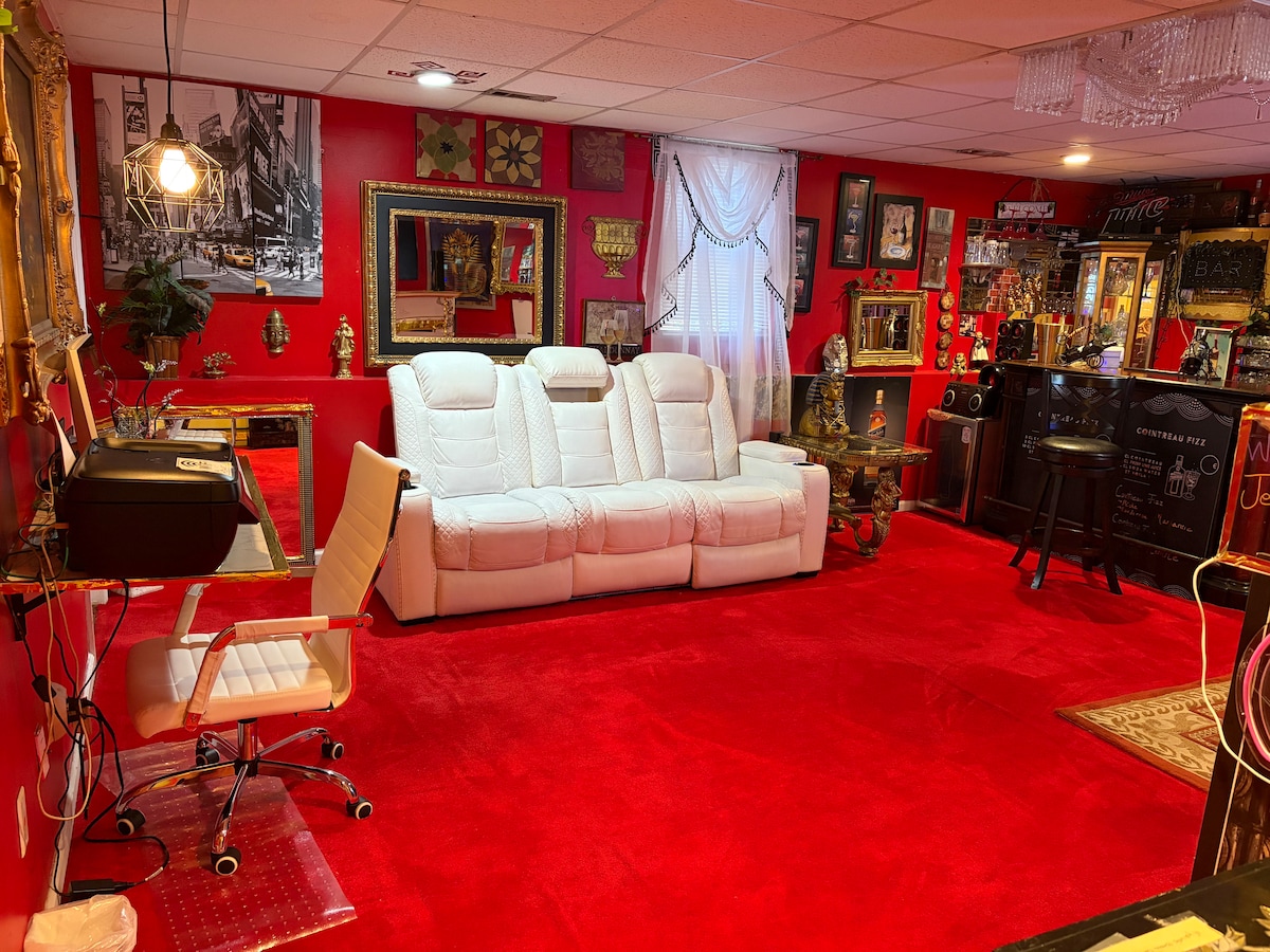 28 minutes from Mercedes-Benz Stadium two bedrooms each bedroom w television Roku queen size beds for each room, living room/w comfortable reclining sofas .television w/ Roku . dining area, /w bar small kitchen, Full bathroom .1 side of garage., Internet extenders for fast Internet computer for personal use.. printer Central air heating additional electric fireplace. New plug-in heaters every room new bed box springs new surround system.