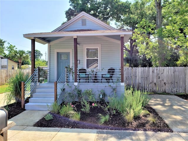 Bem-vindo ao Cooper 's Cottage, uma casa de 1933 lindamente reformada no Garden District de Pensacola, a menos de uma milha do centro histórico de Seville Square e da Palafox St., onde você desfrutará de bares, restaurantes, lojas, galerias de arte e muito mais. Apenas 15 minutos da praia de Pensacola e perto da casa NAS dos Blue Angels. Relaxe em nosso quintal totalmente cercado, que aceita animais de estimação, com churrasqueira a gás, refeições ao ar livre, assentos de lounge com lareira. Há 2 bicicletas, jogos ao ar livre e muito mais. Smart TVs em cada quarto
