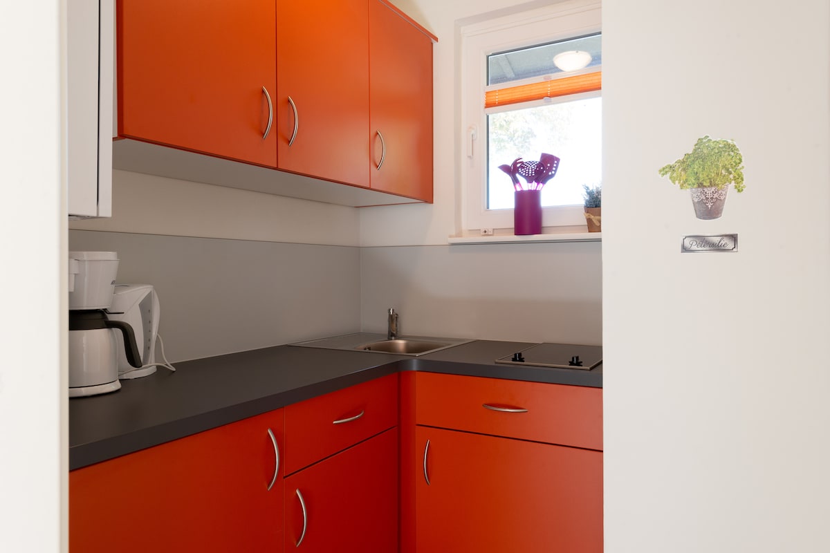 Através do terraço se chega ao pavilhão. No interior há uma sala de estar com uma cozinha americana. Uma placa de indução de 4 bocas, forno e máquina de lavar louça, bem como chaleira, cafeteira e micro-ondas também estão disponíveis. O sofá tem uma função de dormir e a Smart TV de 49 polegadas. Do quarto separado se chega ao banheiro com chuveiro e vaso sanitário. A cama boxspring tem 1,80 m de largura.