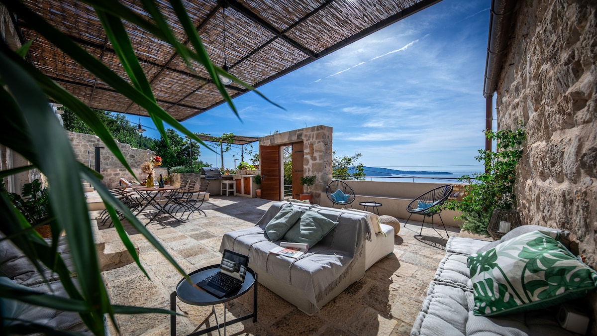 Desfrute da atmosfera aconchegante e relaxante desta elegante casa à beira-mar com uma vista espetacular. Esta casa elegante possui uma sala de estar em plano aberto, um terraço deslumbrante e iluminado pelo sol e uma grelha de pedra ao ar livre. Cozinhe por prazer na cozinha moderna grande e totalmente equipada que se abre para o pátio do jardim para um almoço perfeito na sombra natural. Relaxe nos quartos com vista para o mar e banheiro privativo e aproveite o sol e o aroma do mar em sua própria varanda.