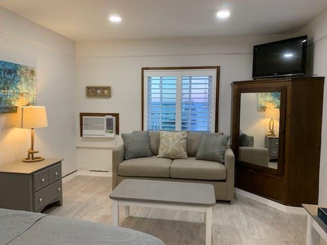 Quarto com cozinha e vista para a praia – 2 hóspedes | Refúgio elevado na costa com kitchenette, cama queen, casa de banho privada e acesso a praia privada Localizado no segundo andar do Vineyard Harbor Motel. Desfrute de vistas deslumbrantes para a praia a partir da sua janela ou relaxe no terraço partilhado do lado de fora. Com acesso direto à nossa praia privada, está a poucos passos da areia e do mar. Confortável, panorâmico e bem equipado, este quarto oferece a combinação perfeita de charme da ilha e conveniência moderna.