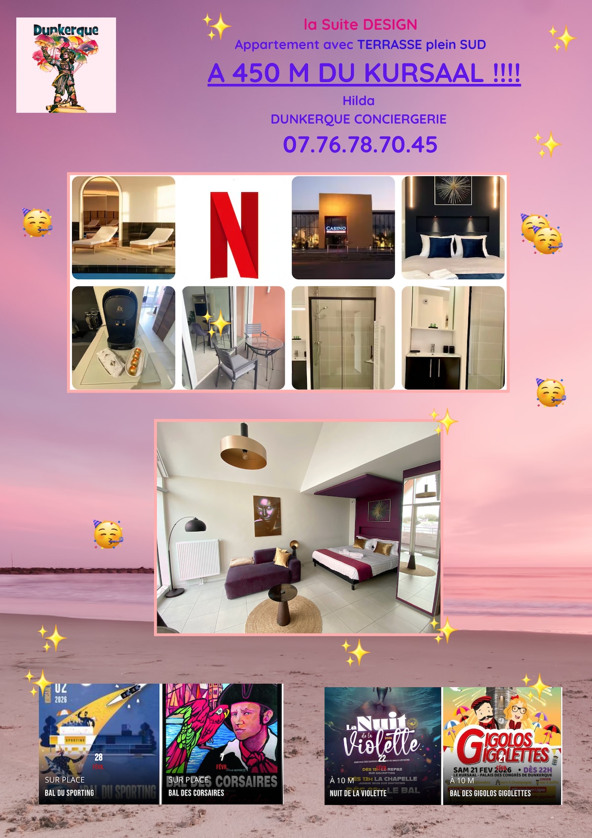Apartamento estúdio virado para o sul com varanda localizado a poucos passos da praia, restaurantes, a 2 minutos a pé do Palácio dos Congressos Kursaal onde acontecem os bailes de Carnaval, Feira do Vinho e da Cerveja, Feira de Comidas, outras feiras, shows... da piscina Olímpica Paul Asseman, do museu Frac, do museu Laac, do museu da guerra, cassino, boliche. A pista de patinação Michel Raffoux fica a 8 minutos de carro. Ônibus gratuitos 7 dias por semana. Estacionamento gratuito ao lado do prédio.