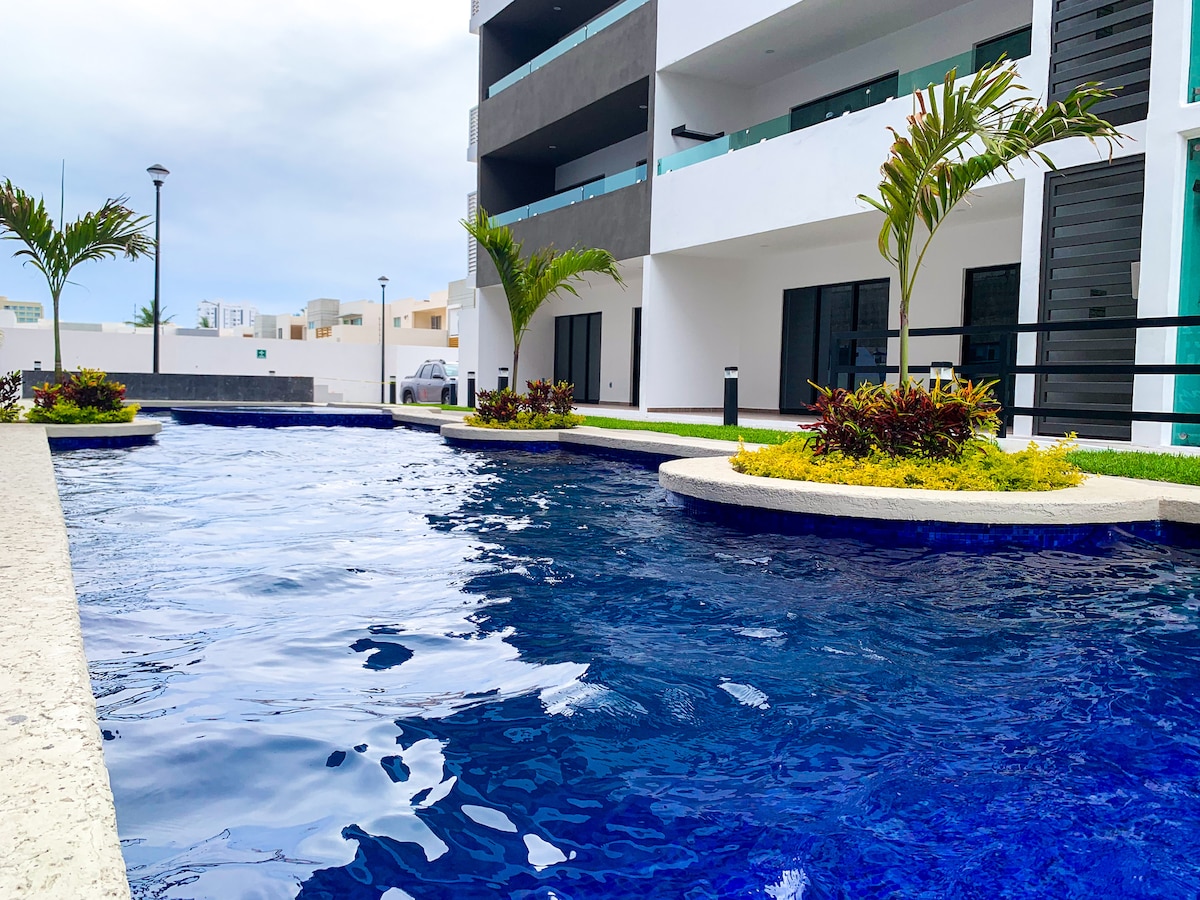 Eleve a sua estadia em Torreón com este apartamento elegante e novinho em folha num arranha-céus deslumbrante dentro de um complexo polivalente vibrante! Apartamento de luxo a minutos do aeroporto. Ideal para negócios, famílias ou casais, dispõe de uma área de estar moderna com vista para a cidade, smart TV e Wi-Fi rápido. Desfrute de uma cozinha chique, uma cama king de pelúcia e uma casa de banho tipo spa. Descontraia com uma piscina, ginásio, cozinha gourmet, espaço de coworking e sala de jogos para crianças. Perfeito para trabalho ou lazer num complexo vibrante!