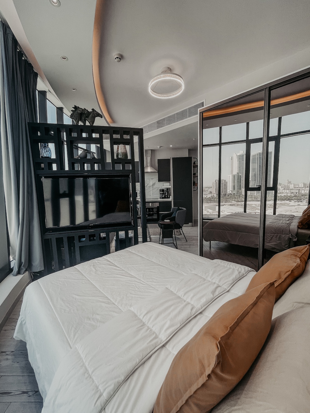 O apartamento fica em um edifício alto com vista para o mar e para a cidade. Inclui um quarto, uma cozinha aberta e uma sala de estar. Tem algumas das melhores comodidades da região, incluindo uma piscina, área de churrasqueira, cinema, etc. convenientemente localizado perto do Shopping Juffair, Shopping Oasis, uma farmácia e uma lavanderia, Juffair é um bairro vibrante e cosmopolita conhecido por seus bares, restaurantes e cafés, e está perto do Forte de Bahrain, do Museu Nacional e a 16 minutos do Aeroporto de Bahrain.
