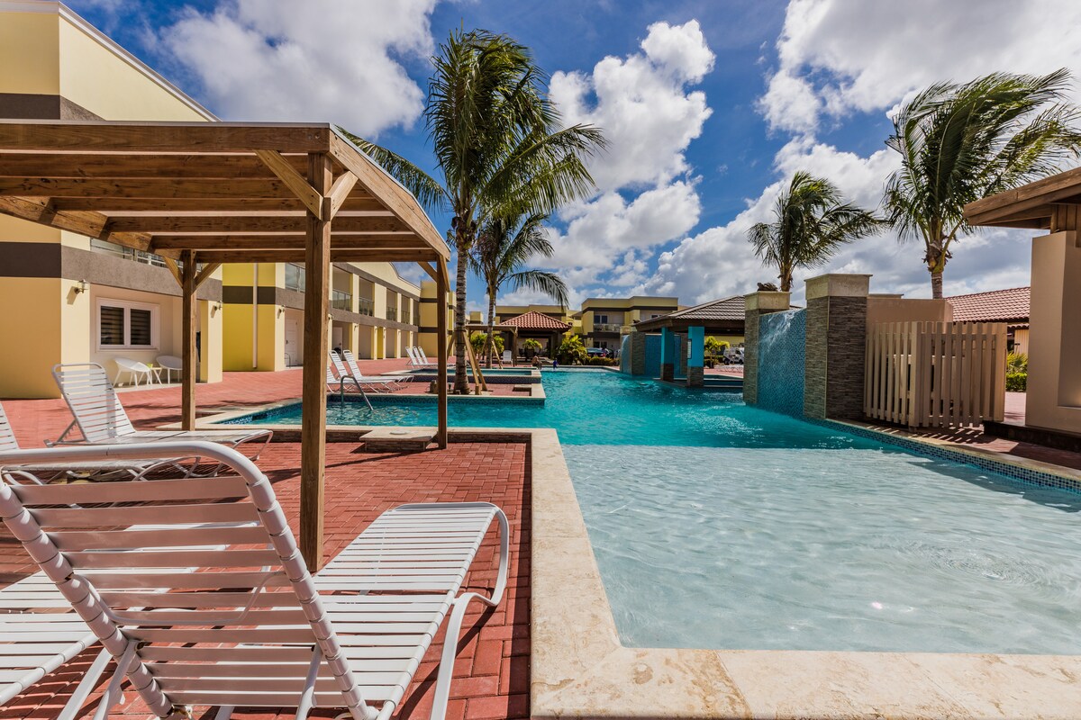 Relax & Enjoy! This beautiful apartment (B-06) is located in one of the most stunning and modern complexes in Aruba, Waykiri Condos. The complex features two swimming pools, a jacuzzi (not heated), and three barbecue areas with inviting terraces. The location is perfect, just a 10-minute walk from Palm Beach. By car, you can reach beautiful beaches, the Malmok Boardwalk, high-rise hotels, restaurants, casinos, and supermarkets within 2 minutes. Here you experience the ultimate vacation!