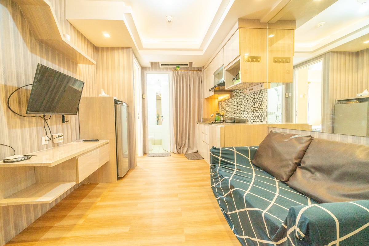 Um elegante estúdio de 24 m² no centro de Jacarta, combinando estilo e conveniência. Inclui cozinha, Wi-Fi rápido, purificação de ar, smart TV de 43", sistema de som e Netflix. É ideal para vários tipos de estadias, com acesso sem contacto e comodidades como piscinas, jacuzzi, ginásio e basquetebol. Agora possui um dispensador de osmose reversa e eliminação de resíduos alimentares, A imagem mostra um fogão a gás que foi substituído por um fogão de indução (para seguir as diretrizes do apartamento para riscos de incêndio)