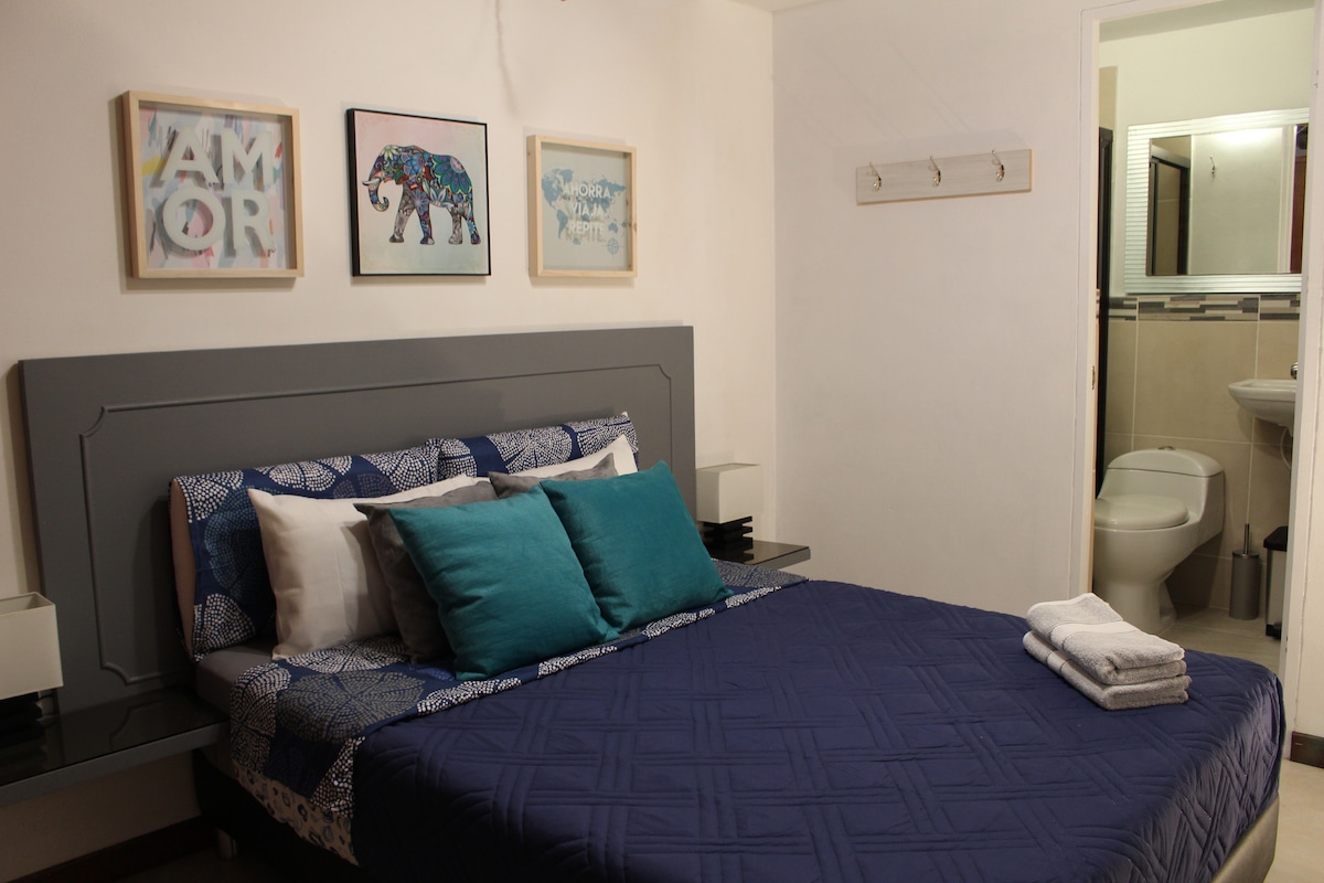 Quarto com entrada independente dentro da casa principal. Comodidades totalmente privadas para os hóspedes: casa de banho no quarto com cama de casal. Possibilidade de alojamento para a terceira pessoa no mesmo espaço (sofá-cama) Smart TV, Frigorífico, WI-FI O apartamento É fornecido com água quente. Boa localização, espaço tranquilo e residencial, acesso a restaurantes, cafés, centro comercial Unicentro e supermercados. Uma quadra da Carrera 70 e perto da estação de metro Estadio del.